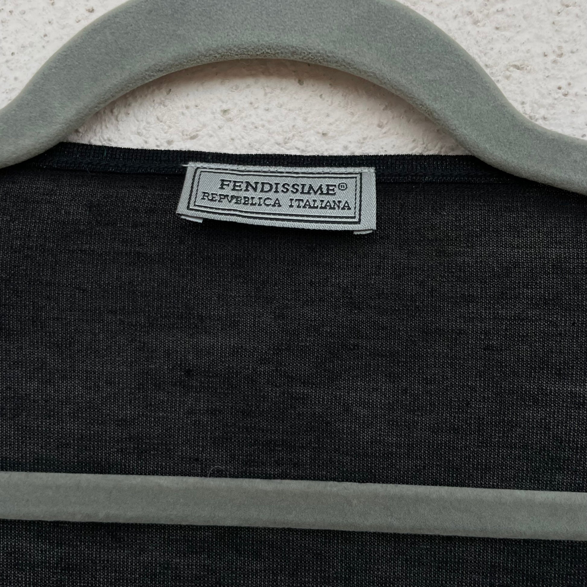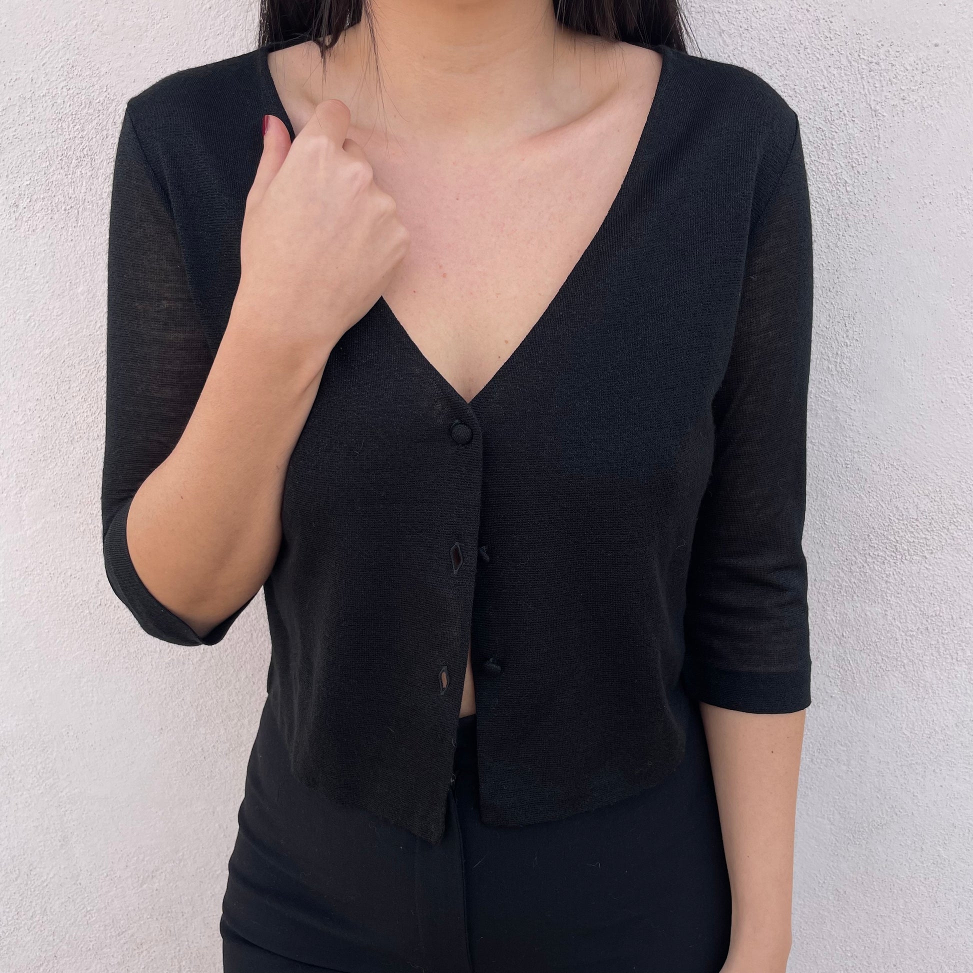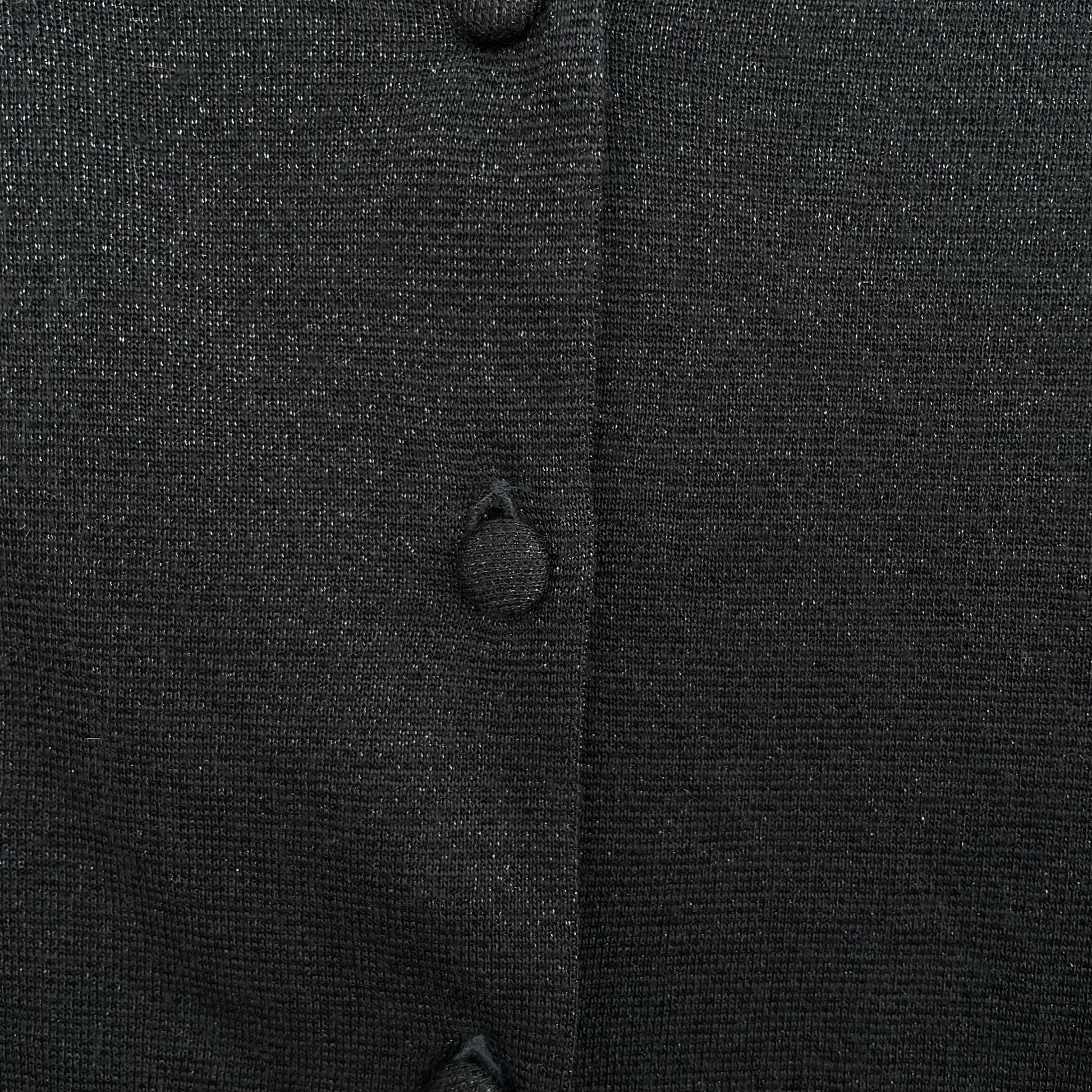 Cardigan cropped nero con sbrilluccichini (lurex) Fendissime (Fendi). Manca il merceologico, suppongo sia un cotone con percentuale di sintetico per il lurex.