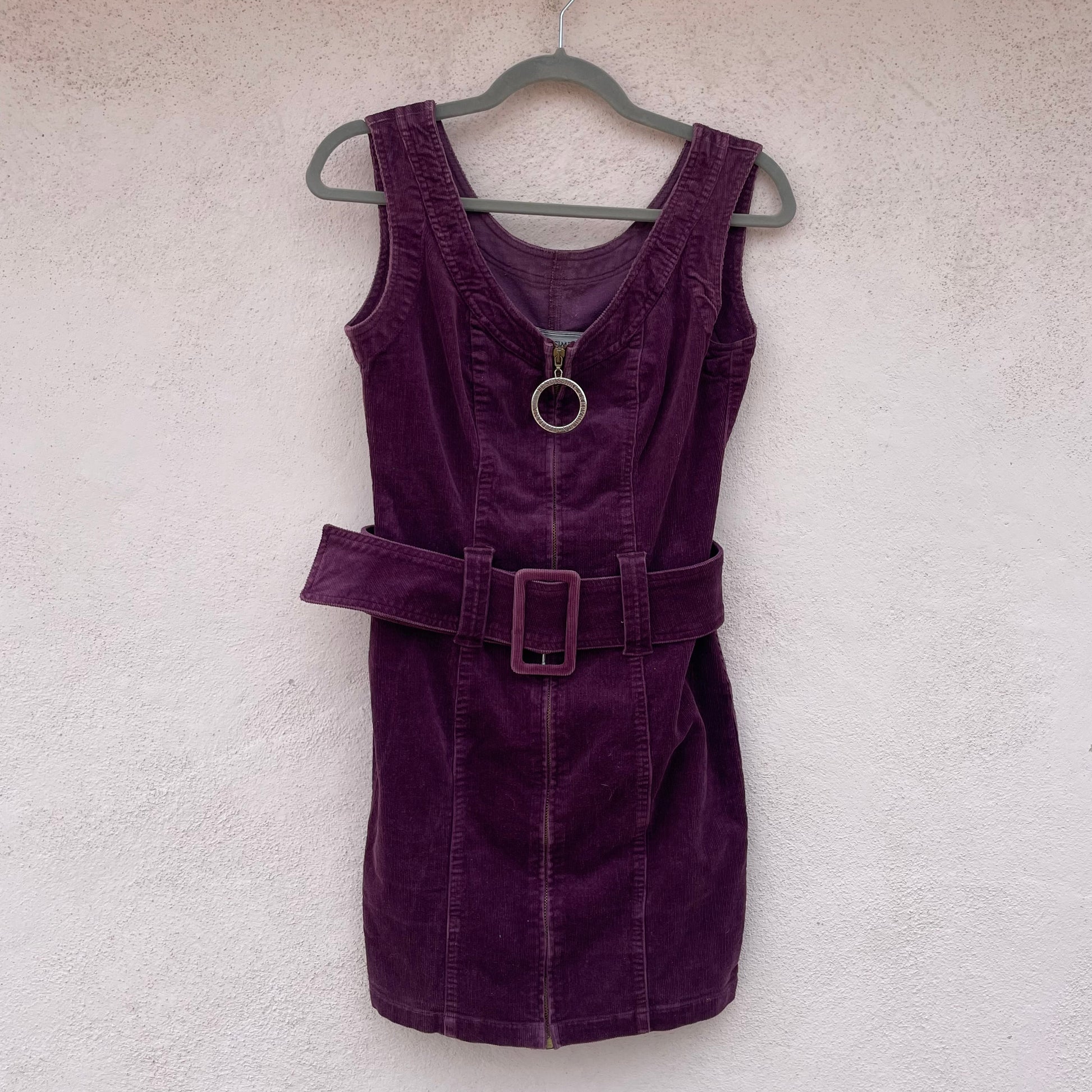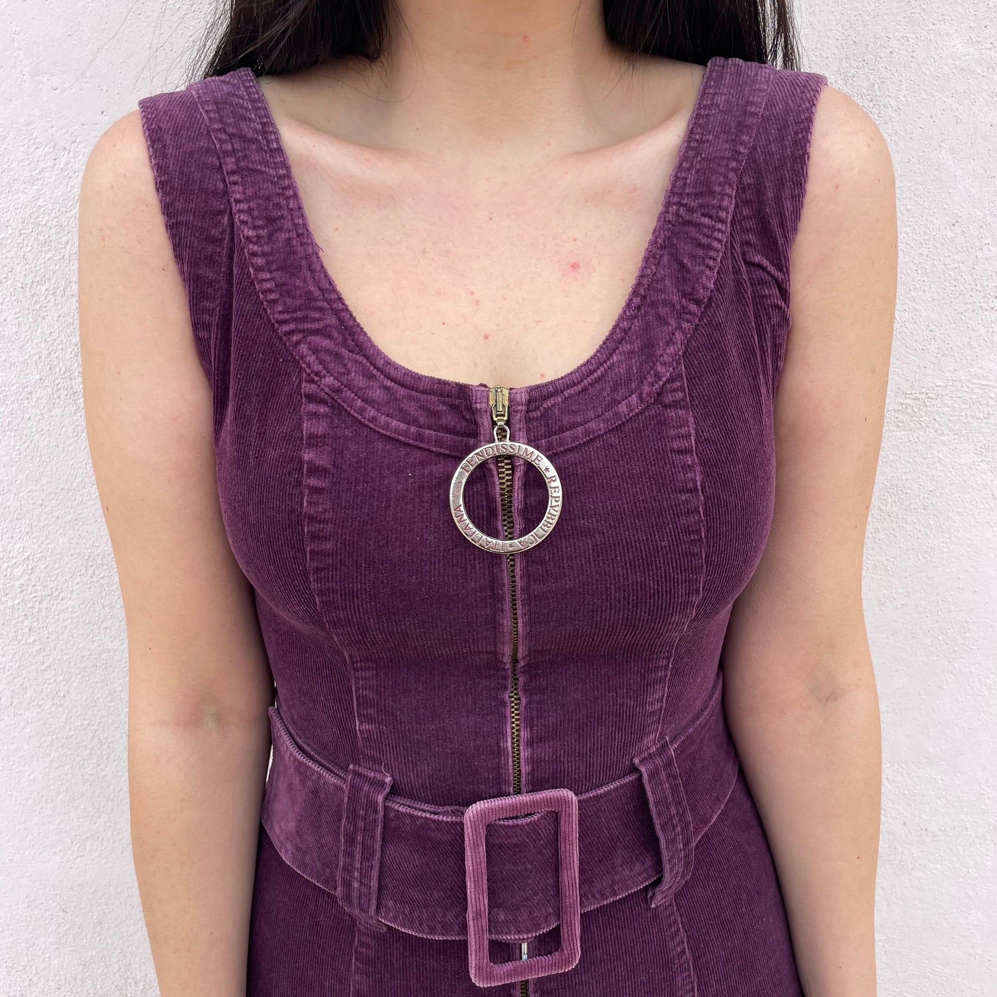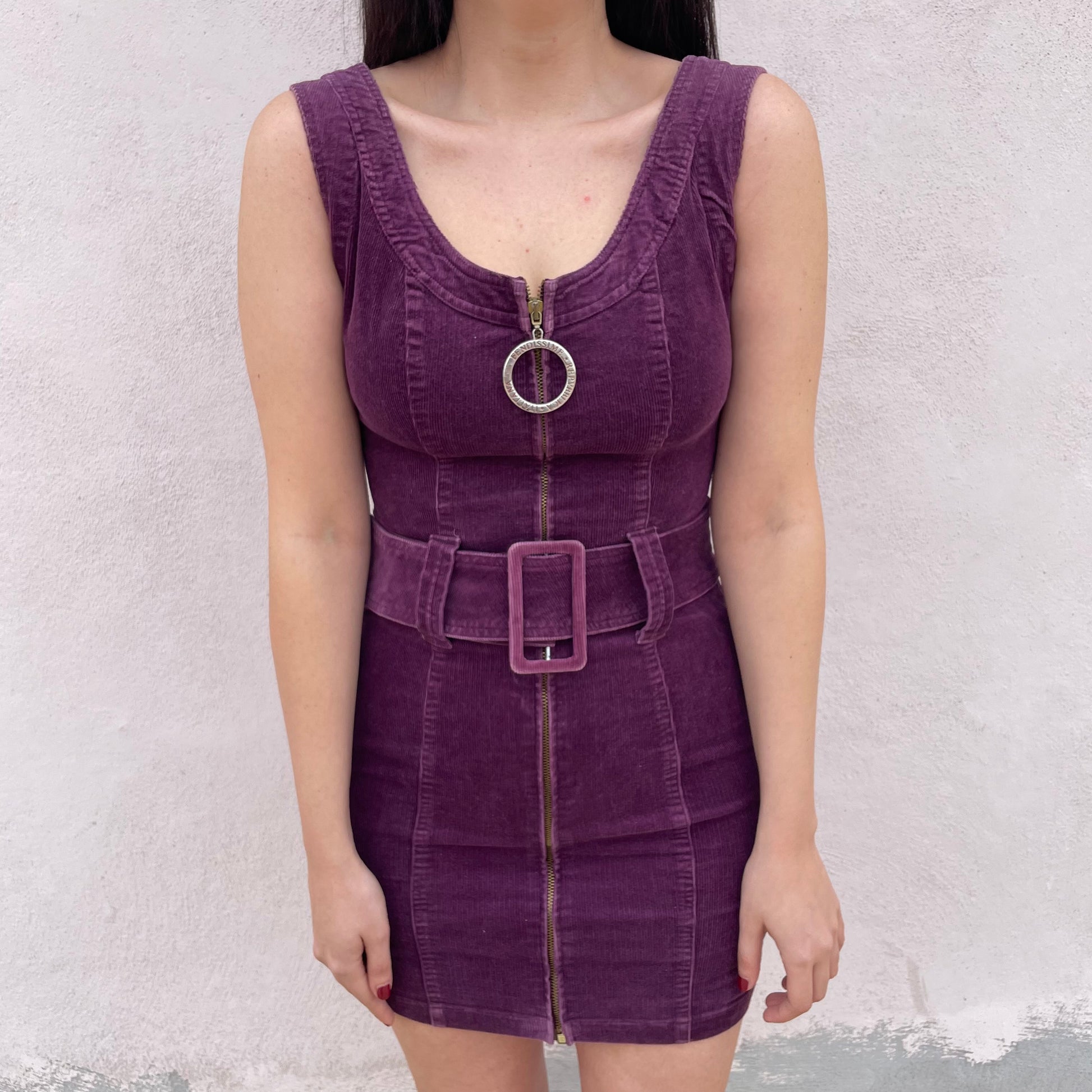 Miniabito in velluto a coste viola Fendissime. Zip centrale, cintura in vita. 96% cotone 2% elastan 2% poli.