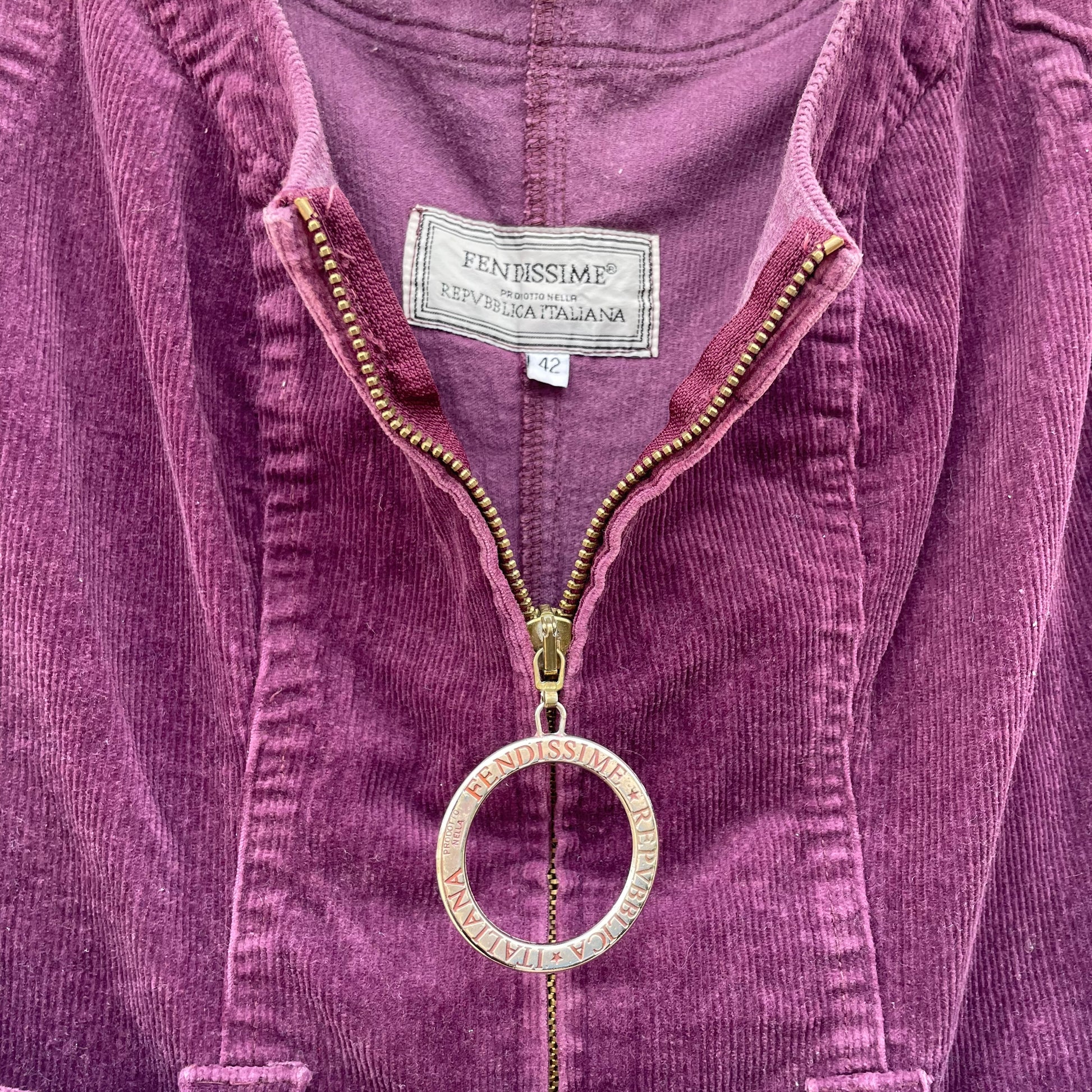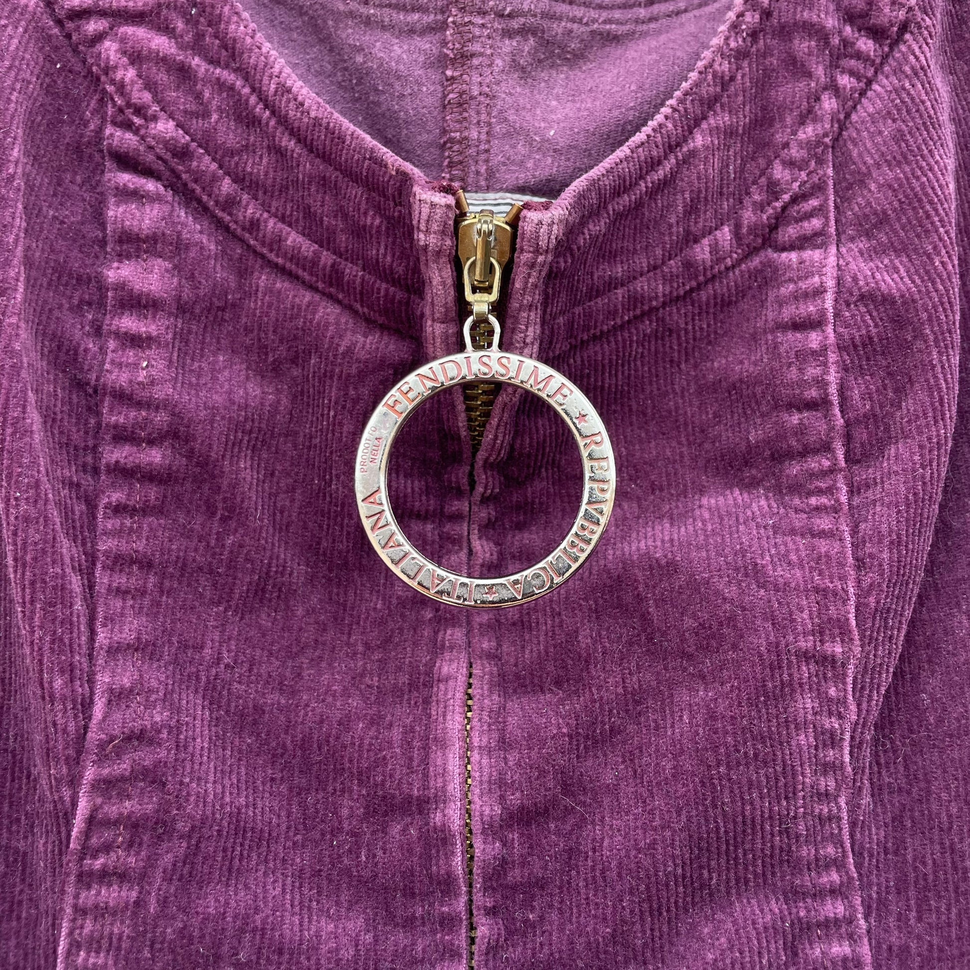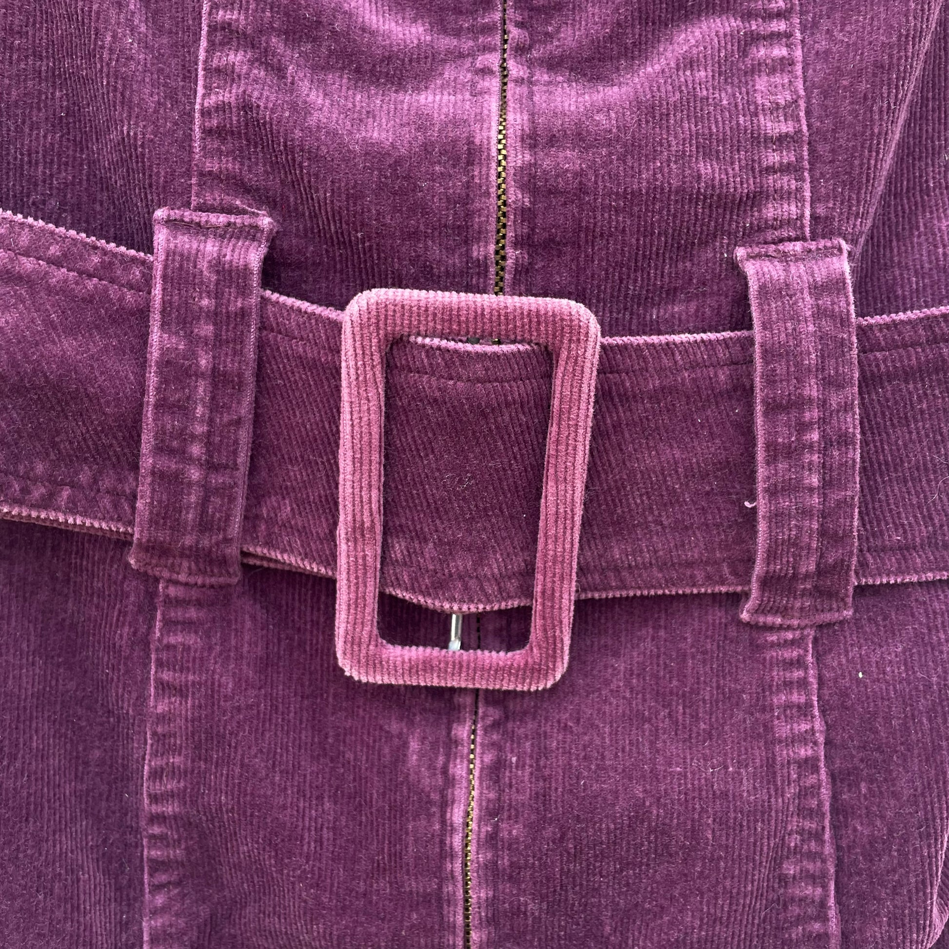 Miniabito in velluto a coste viola Fendissime. Zip centrale, cintura in vita. 96% cotone 2% elastan 2% poli.