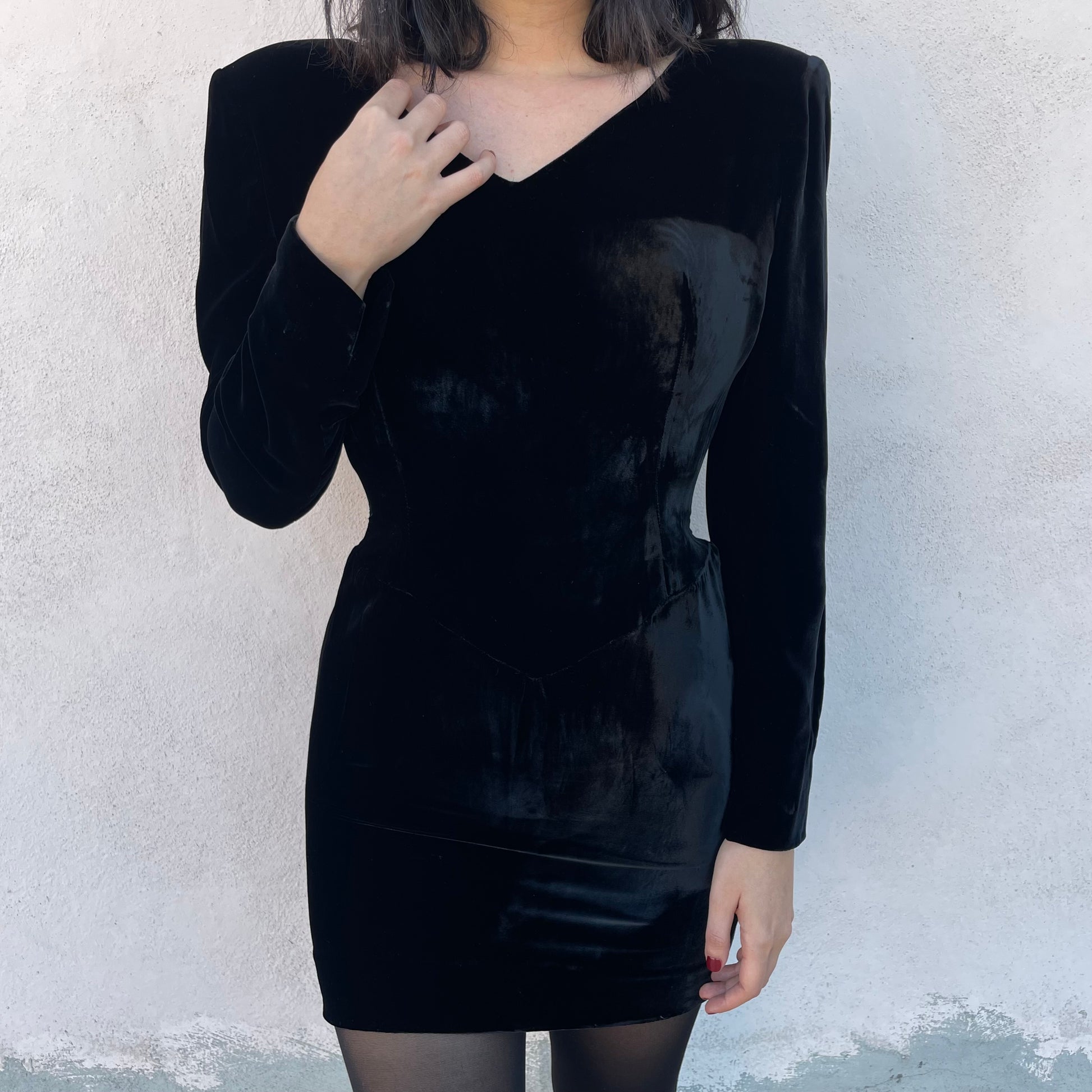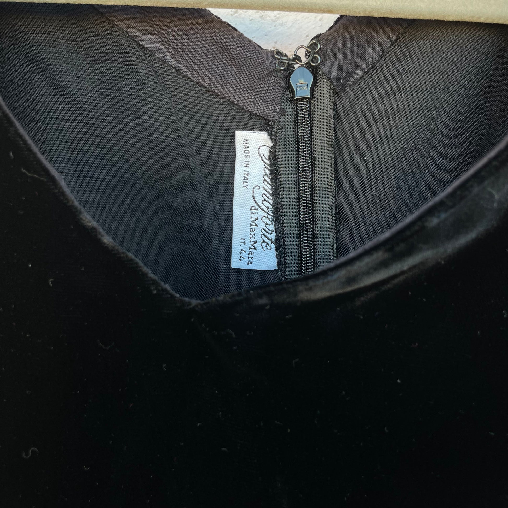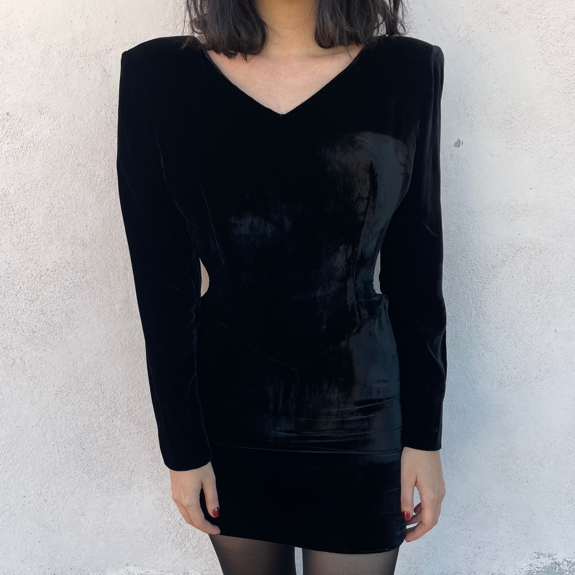 Miniabito Pianoforte by Max Mara in velluto nero liscio. Corpetto a “V”. Manca il merceologico ma suppongo sia un velluto di seta.