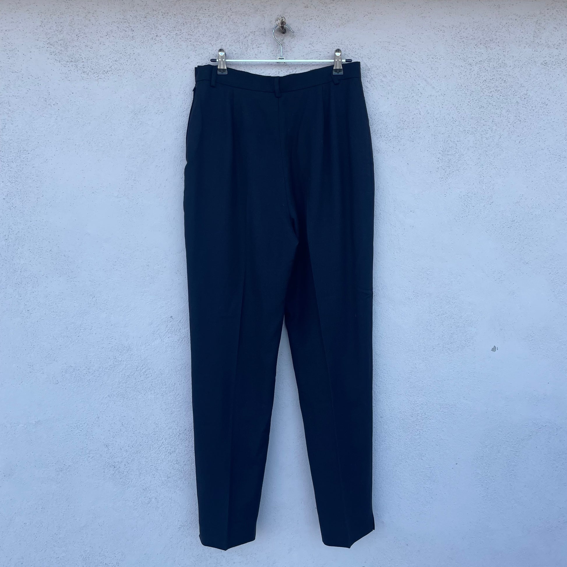 Pantaloni neri Krizia 75% lana 25% cashmere. Taglio sartoriale, chiusura laterale, spacchetti sul fondo.