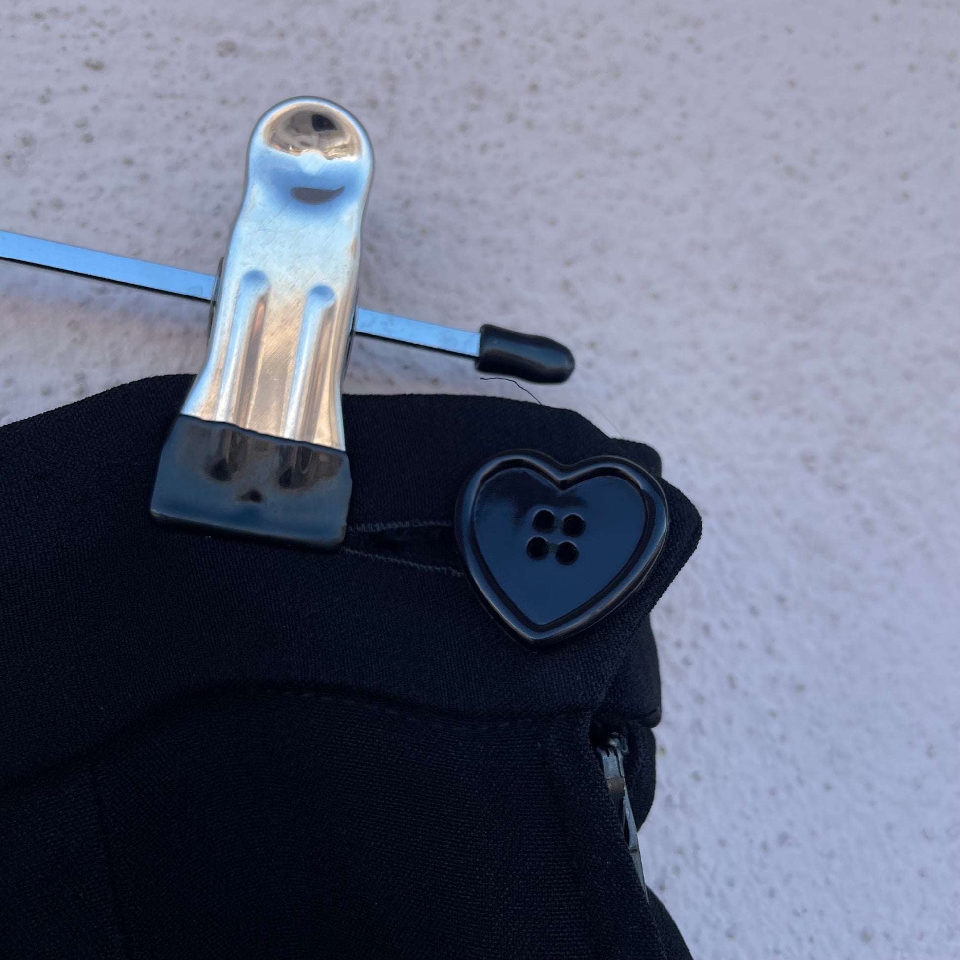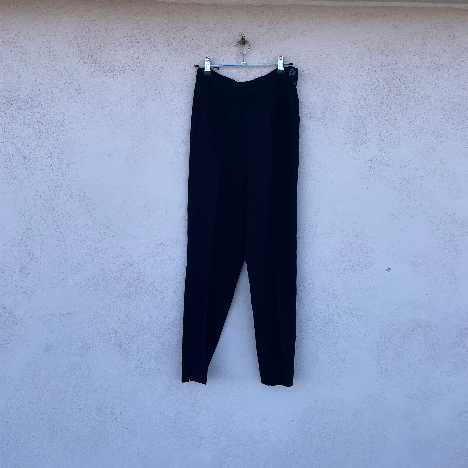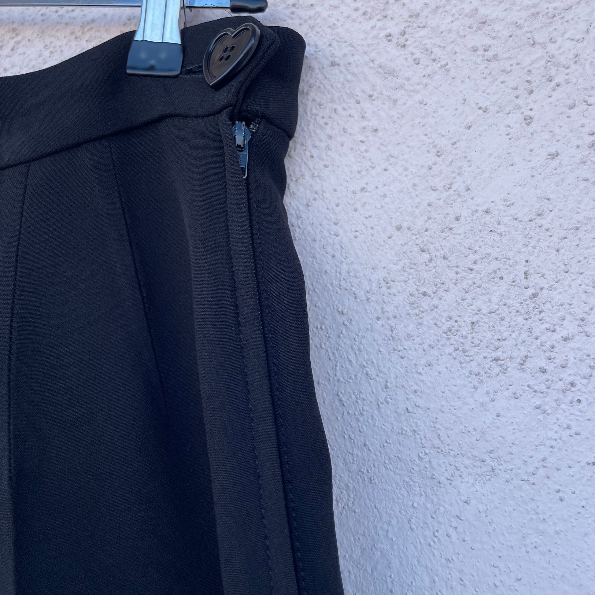 Pantaloni neri a sigaretta a vita altissima Moschino Cheap and Chic. Chiusura con zip laterale e bottone a forma di cuore. 52% rayon 48% acetato.