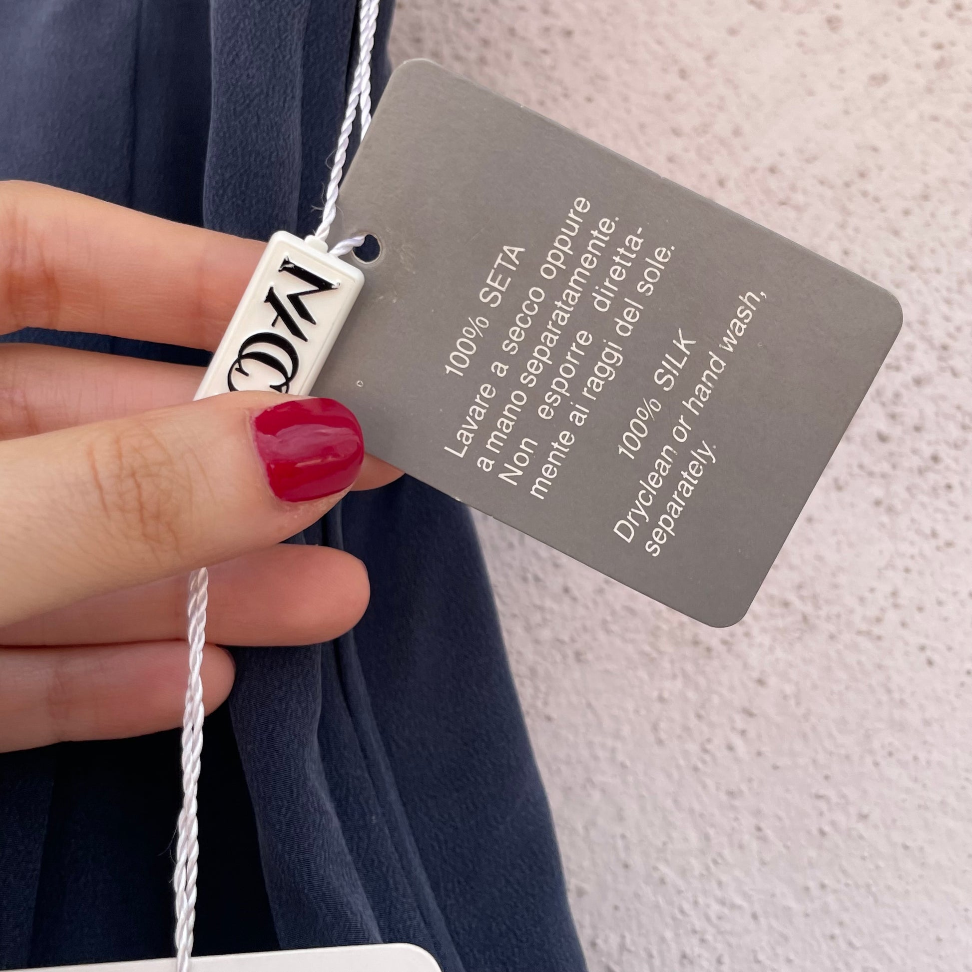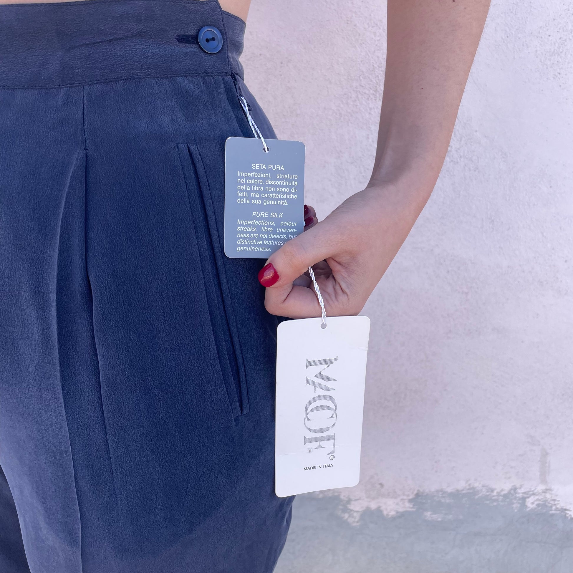 Pantaloni a vita alta con chiusura laterale con zip e bottone. New old stock (vintage nuovi con cartellino). 100% seta.