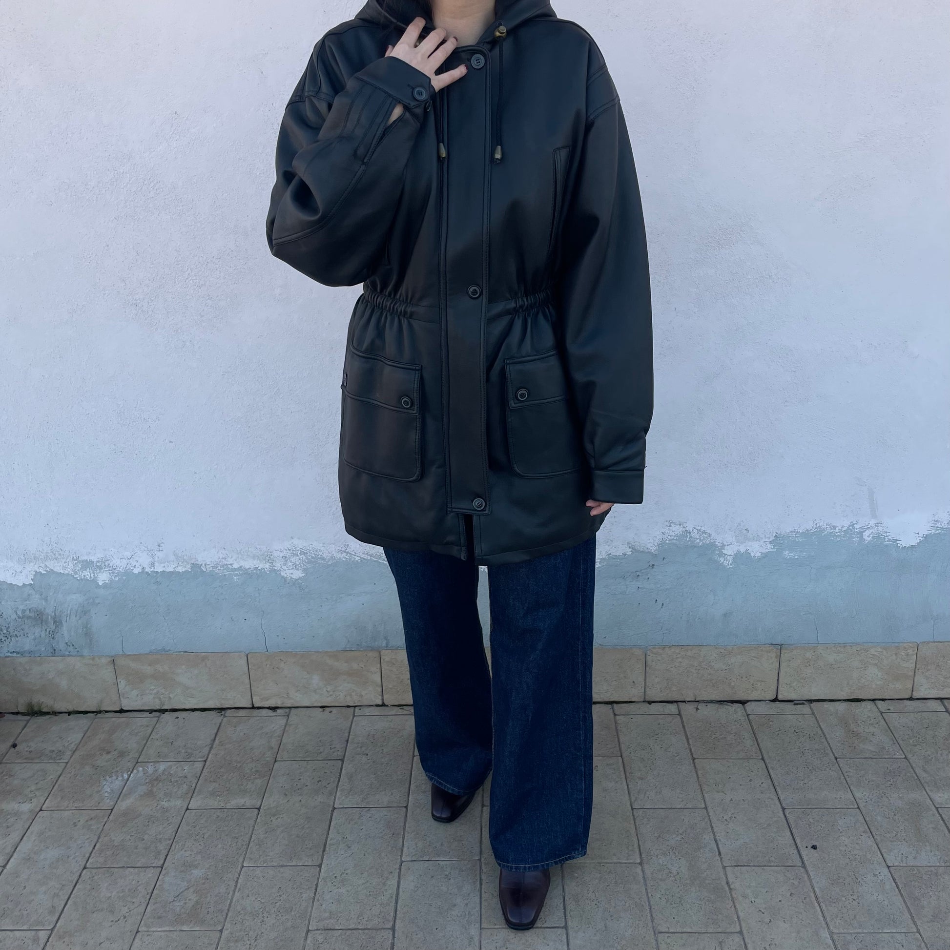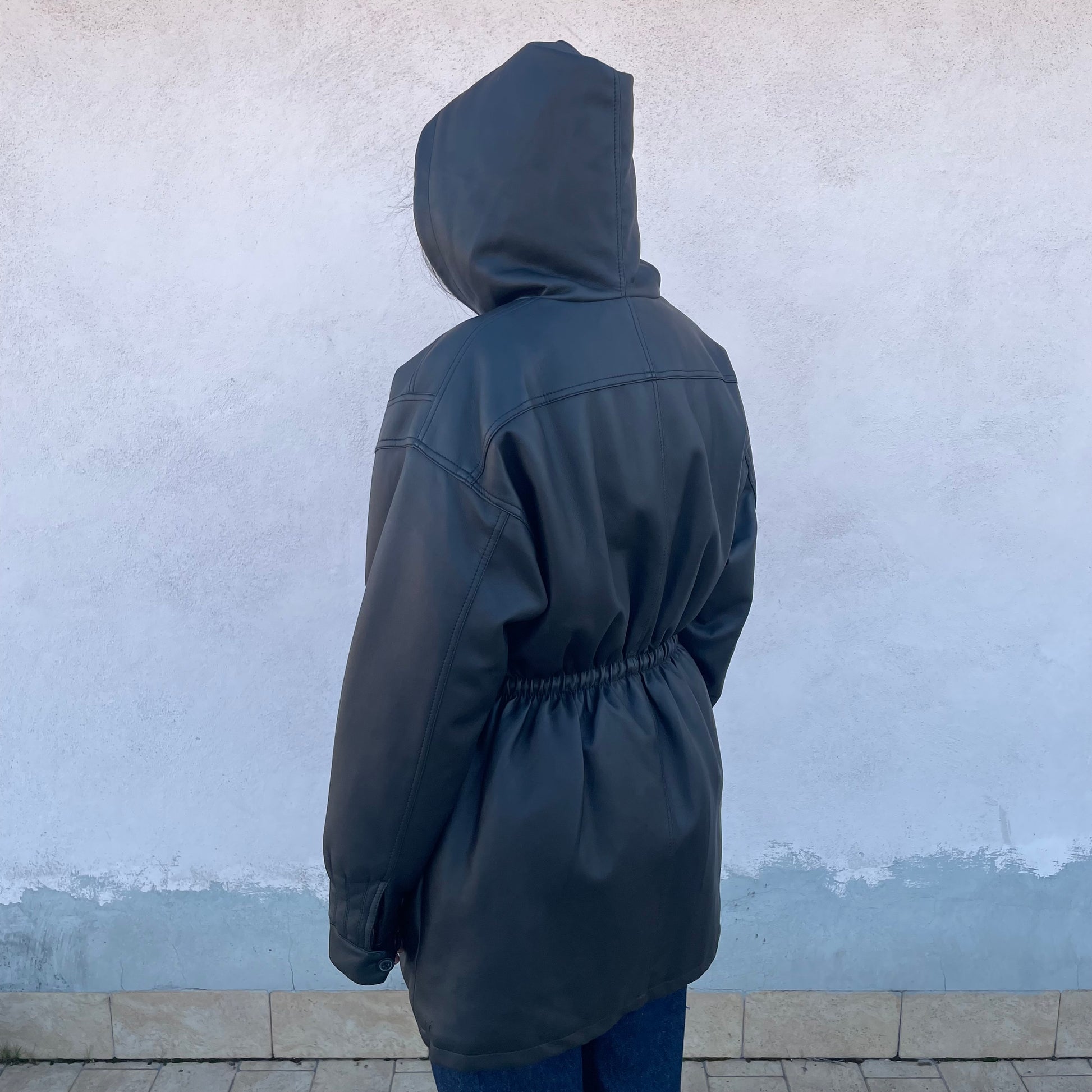 Parka in pvc impermeabile Regina Schrecker. Coulisse in vita per regolare l’ampiezza. Cappuccio.