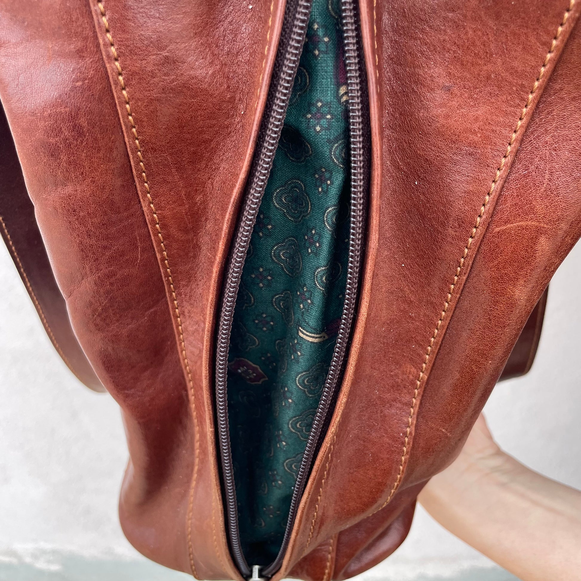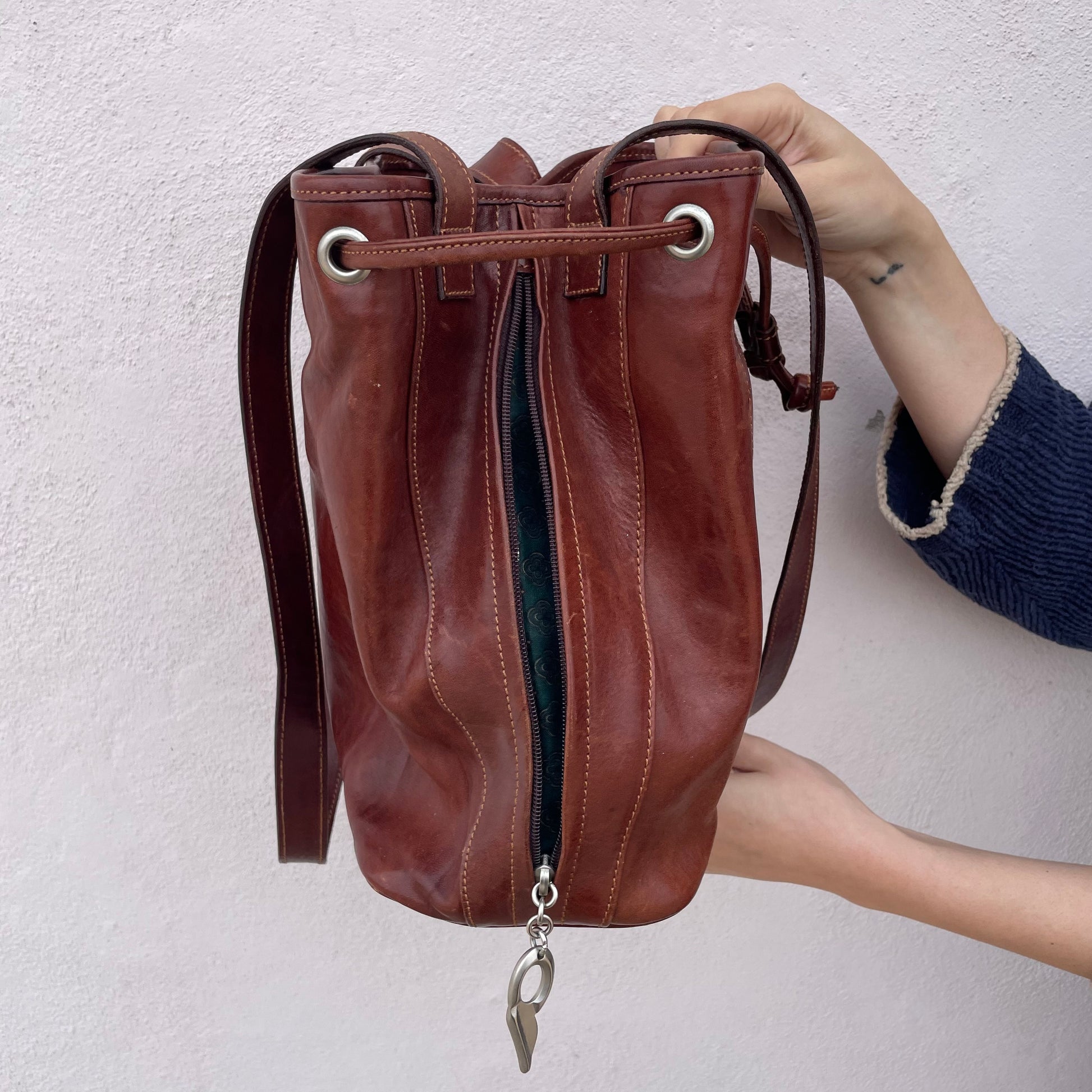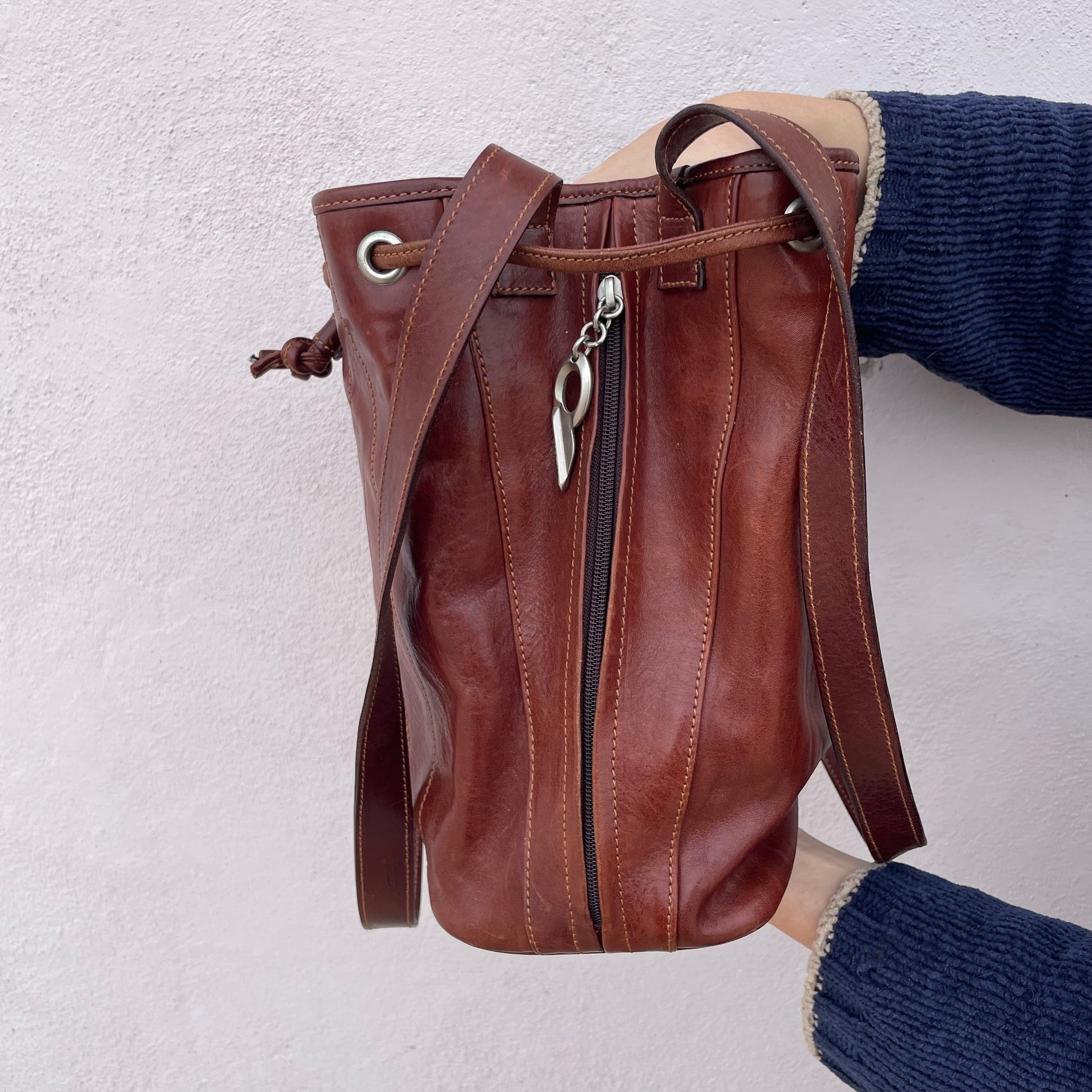 Secchiello in cuoio color cognac. Doppia tracolla, due tasche esterne (zip verticali), due comparti interni.