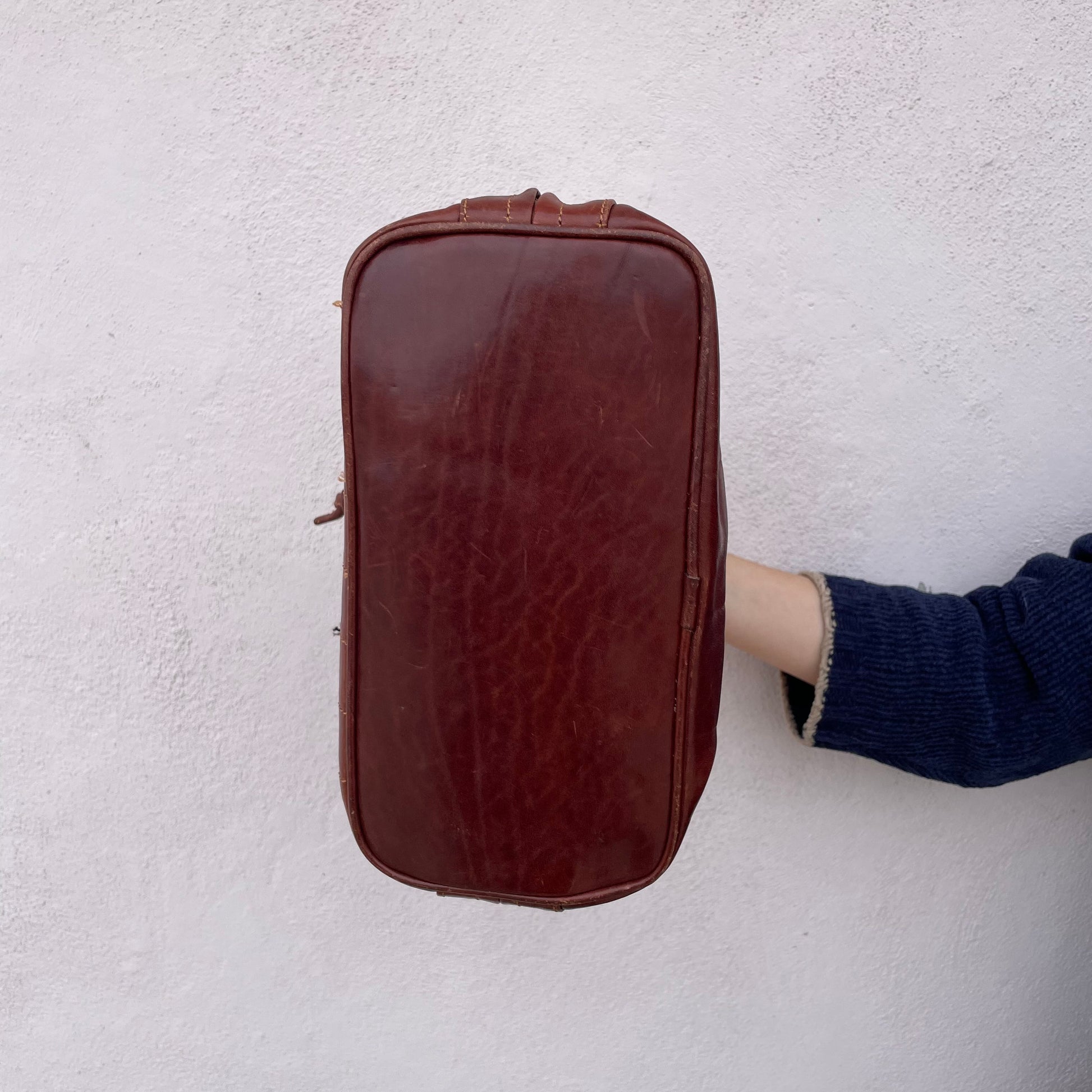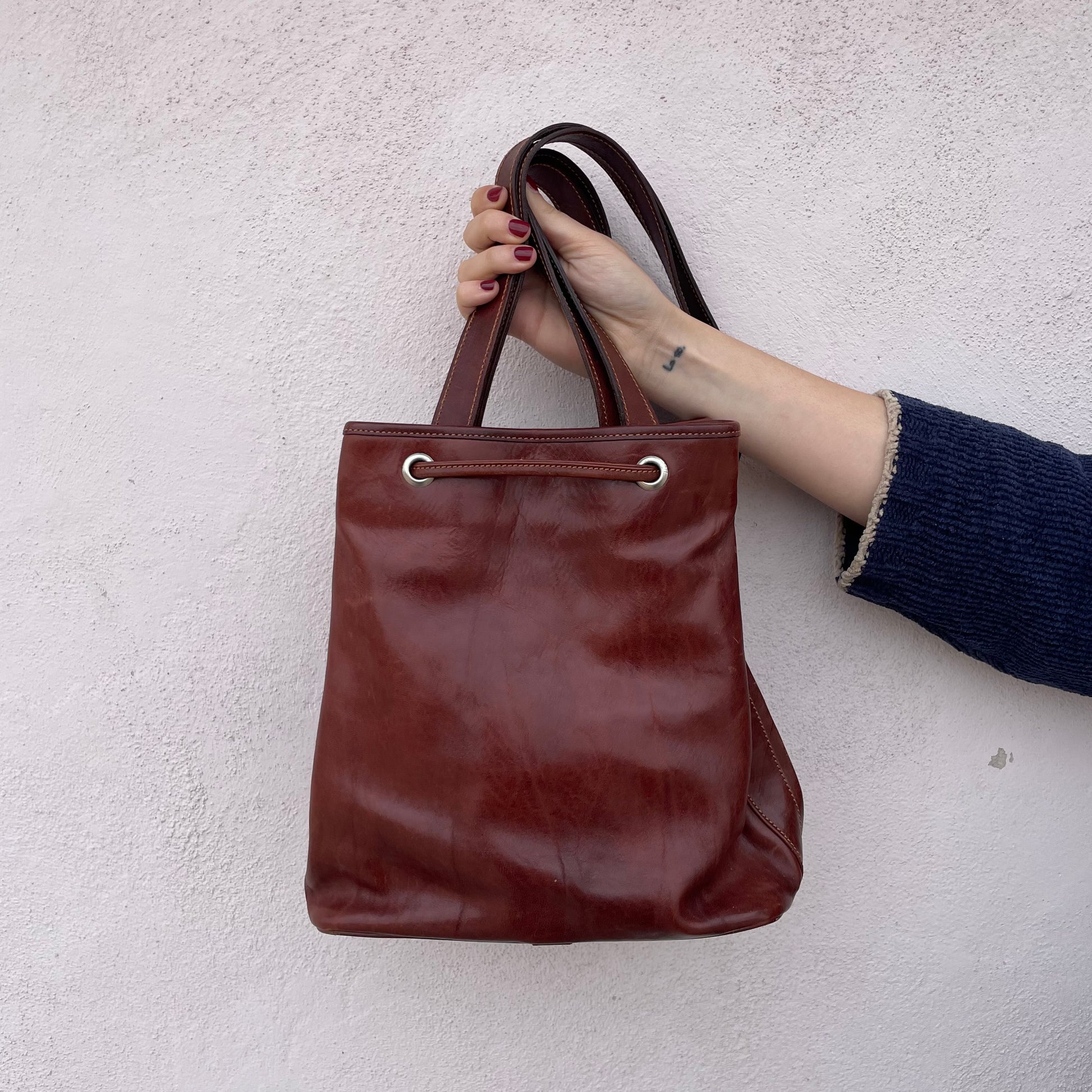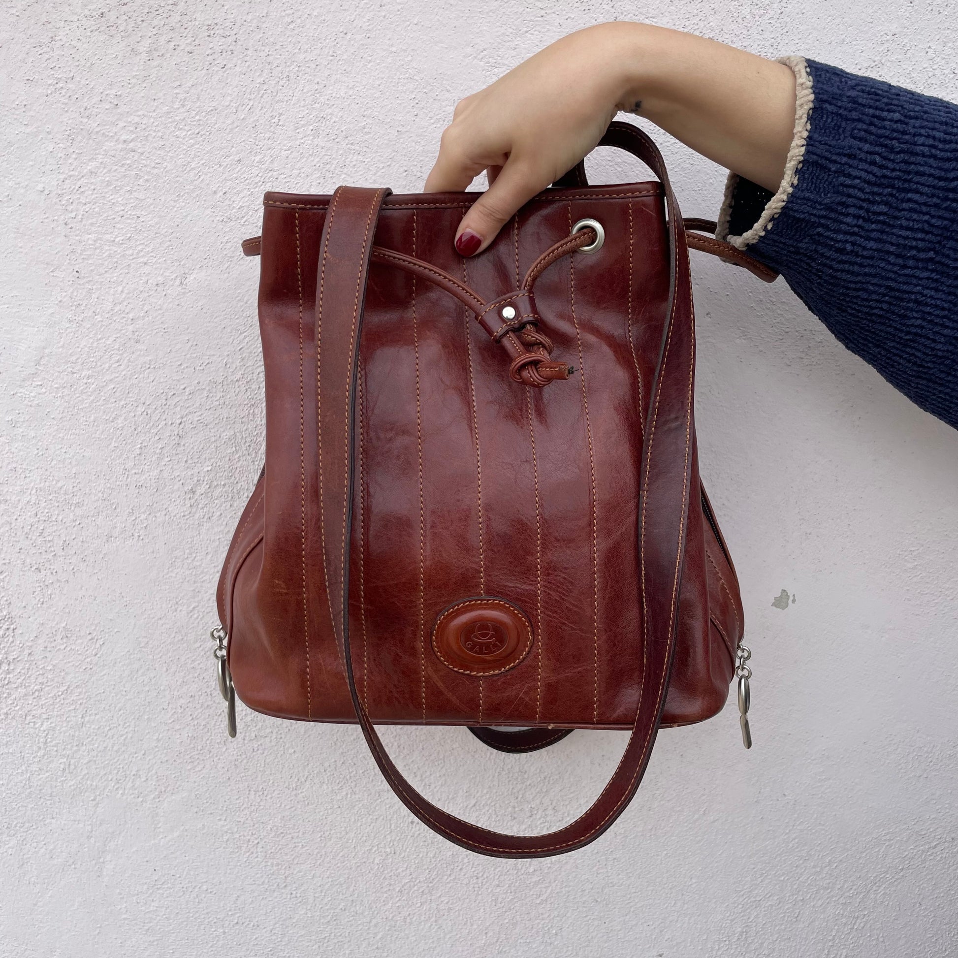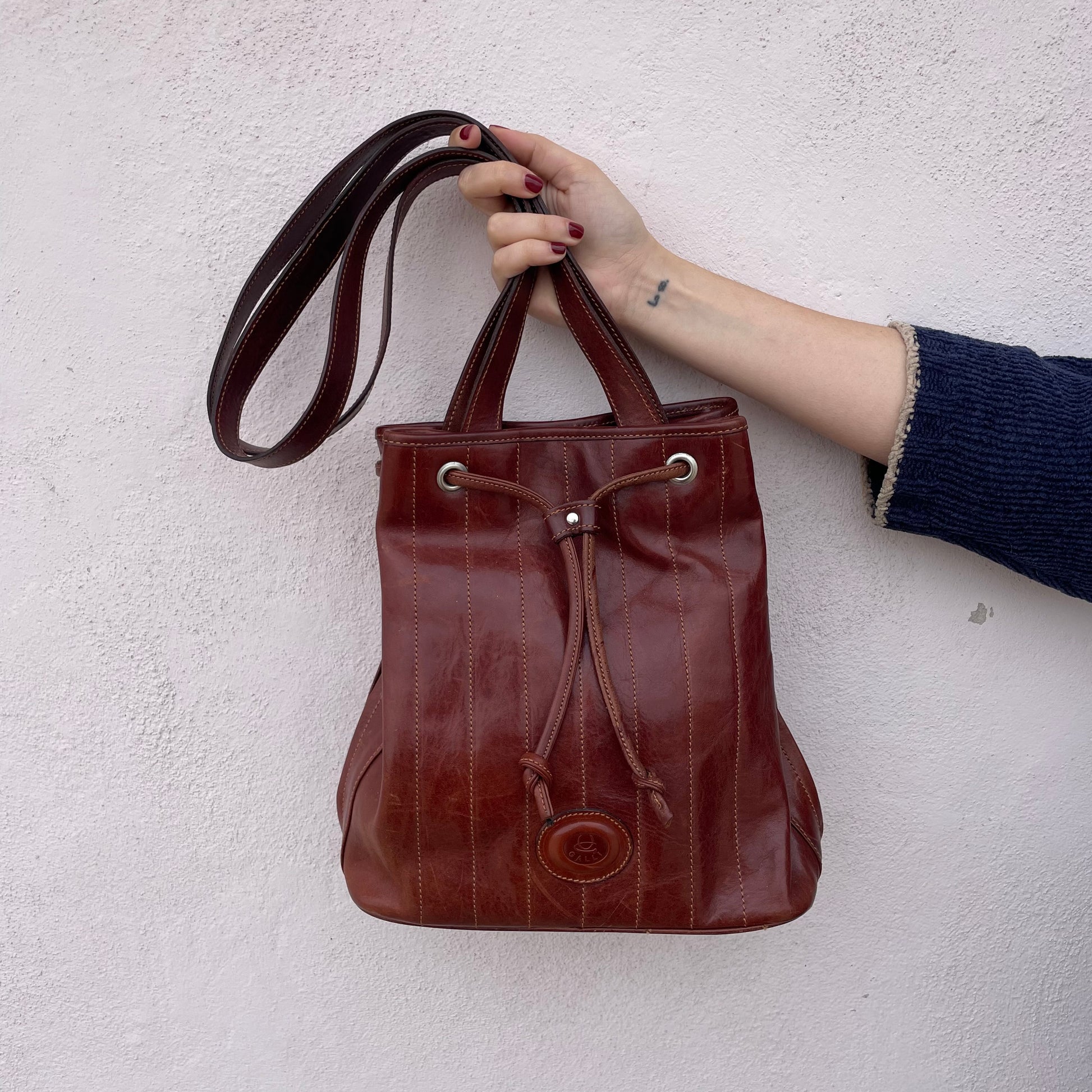Secchiello in cuoio color cognac. Doppia tracolla, due tasche esterne (zip verticali), due comparti interni.
