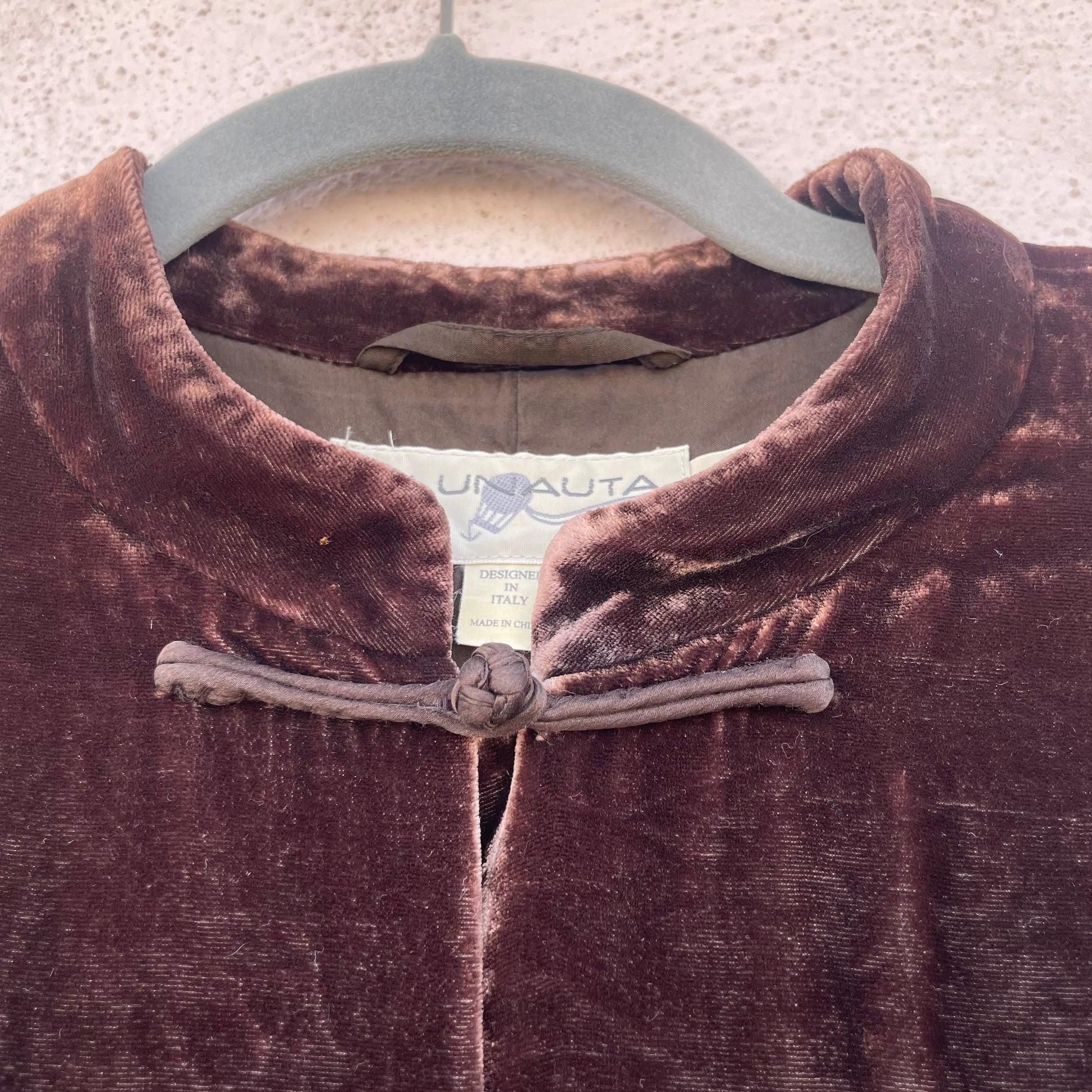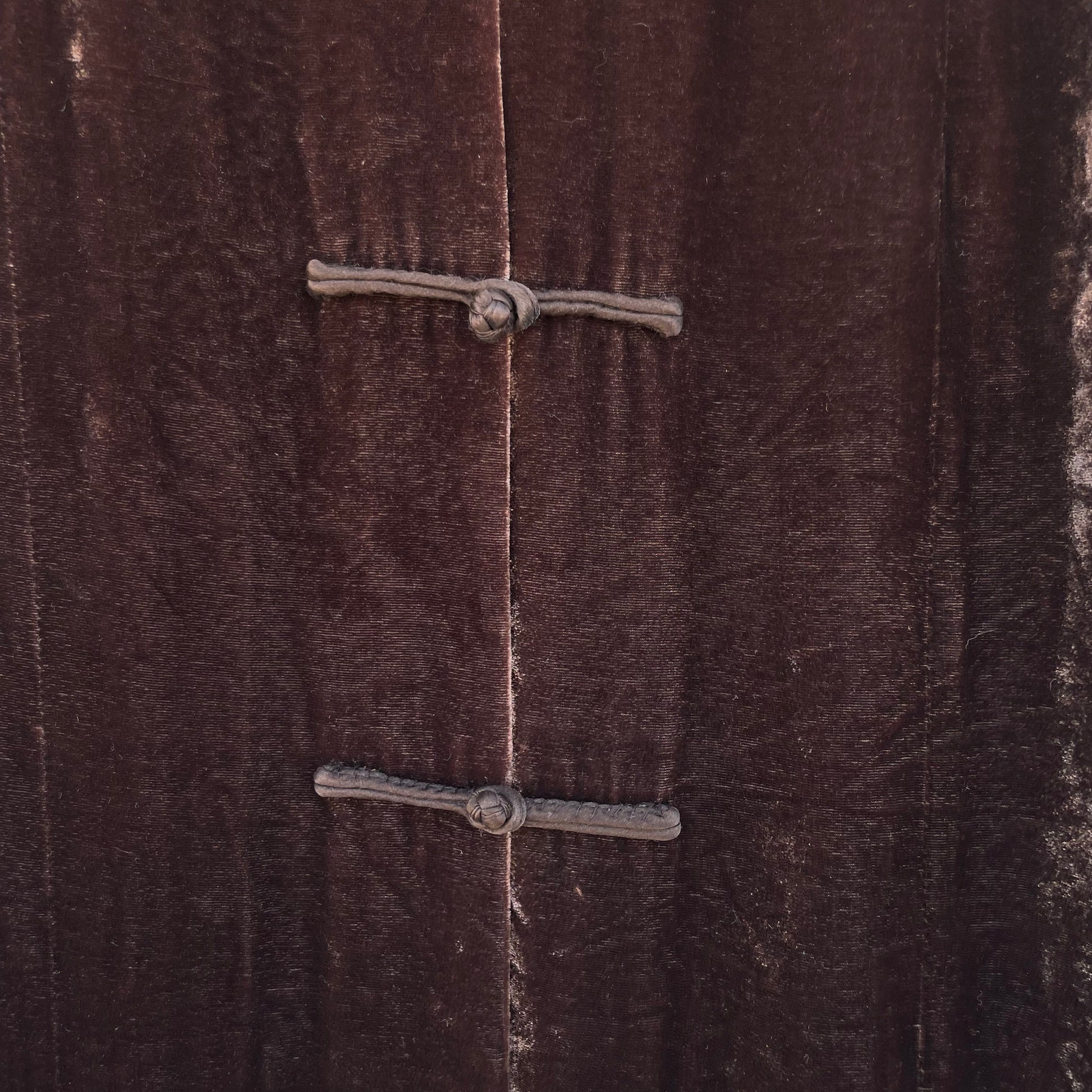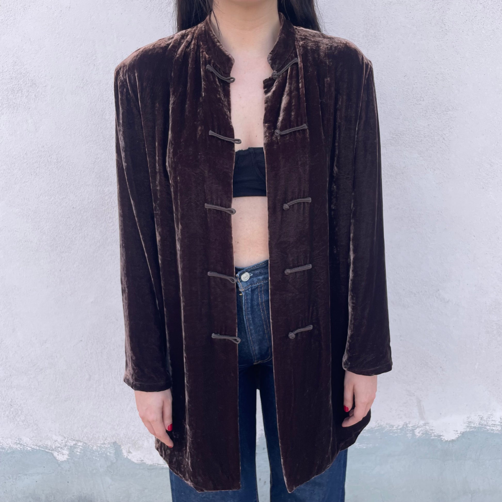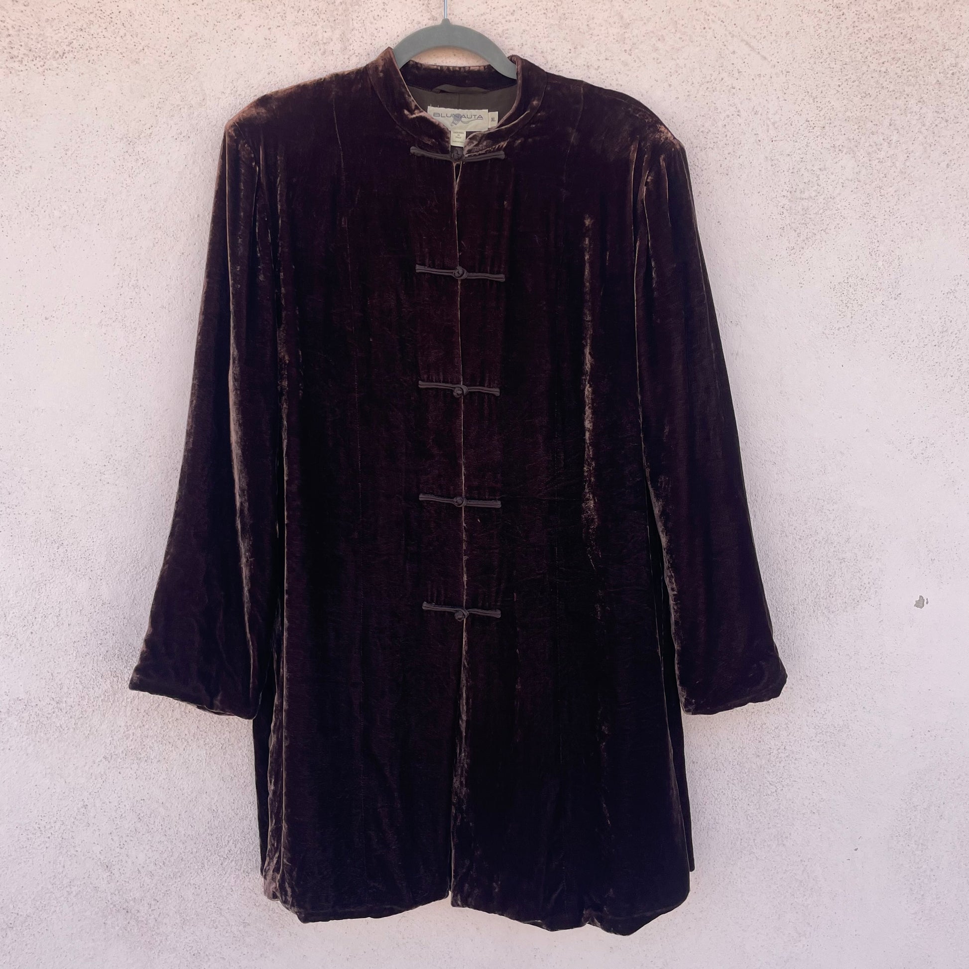 Soprabito/camicione in velluto di viscosa e seta (82%-18%) Blunauta color cioccolato. Chiusura con alamari.
