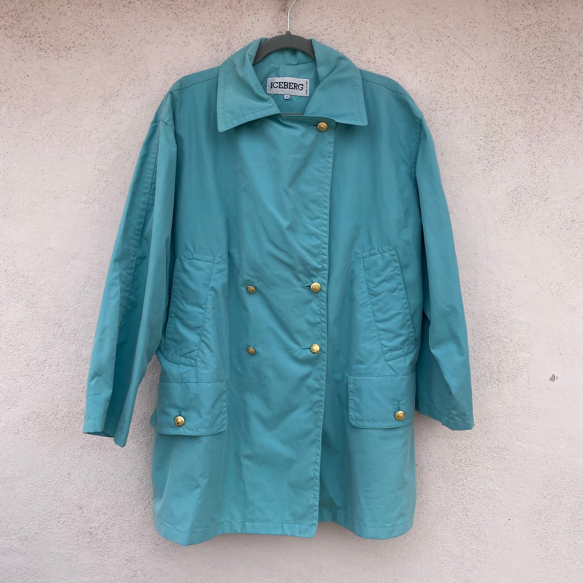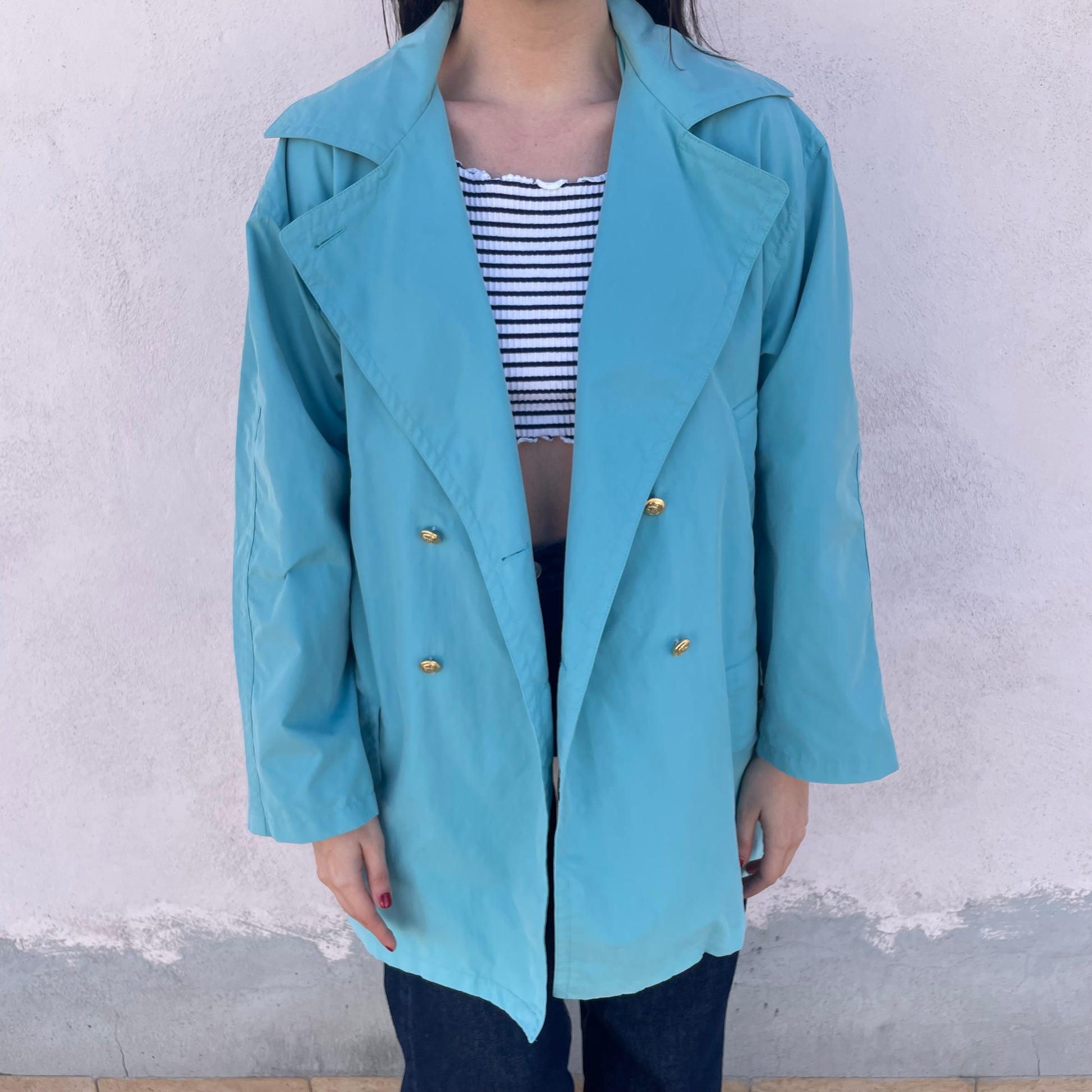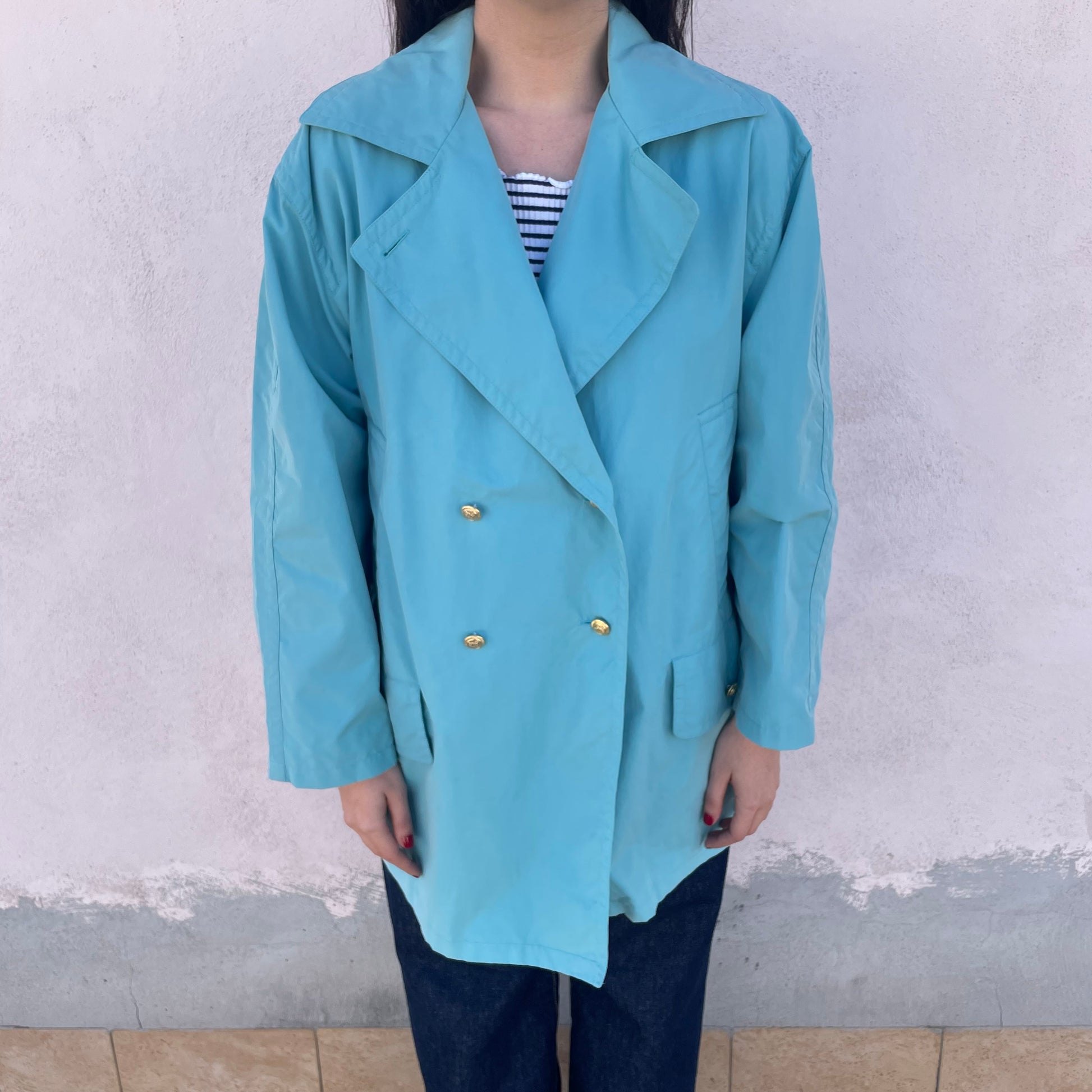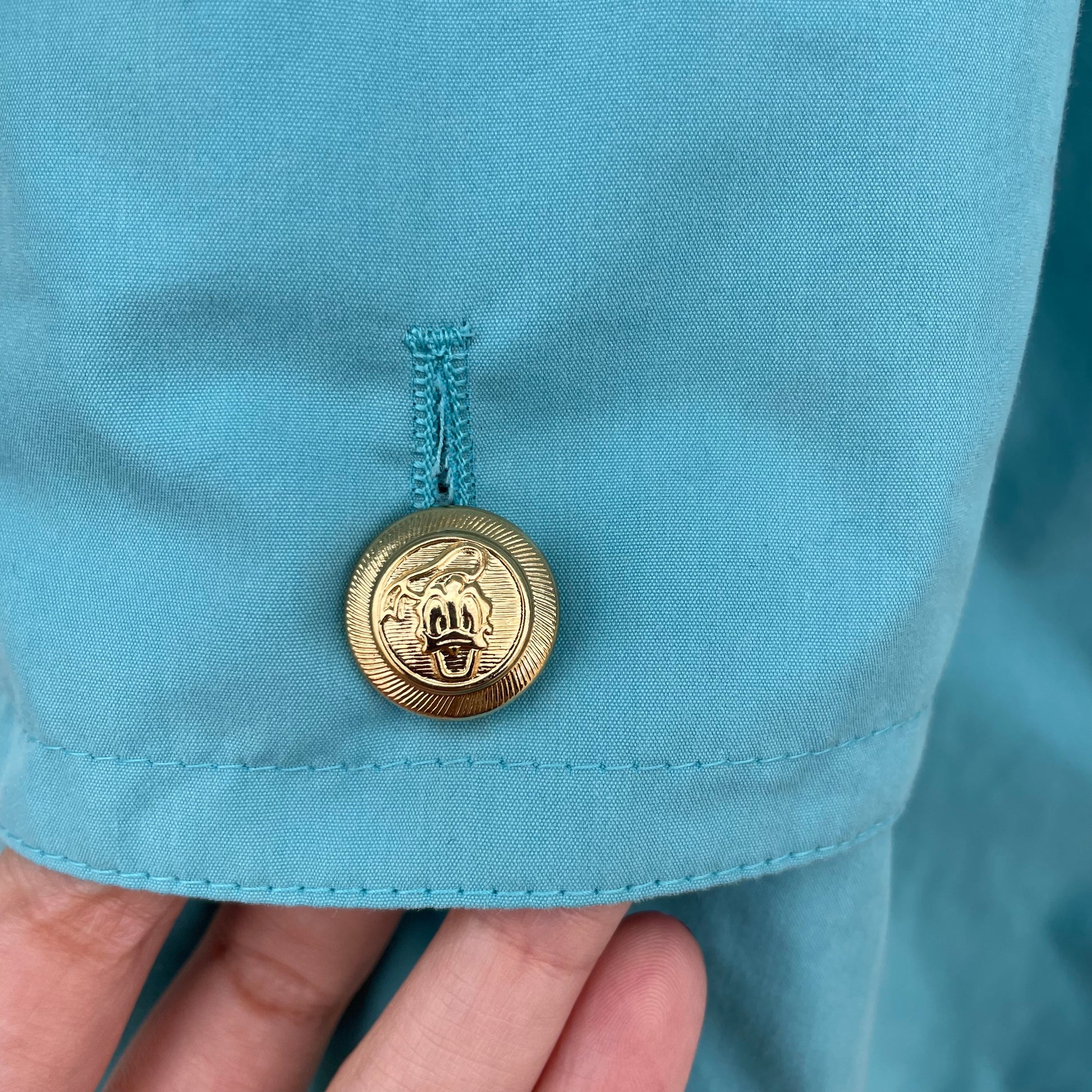 Spolverino Iceberg turchese con bottoni dorati con Paperino. 75% cotone 18% poliestere 7% poliuretano.