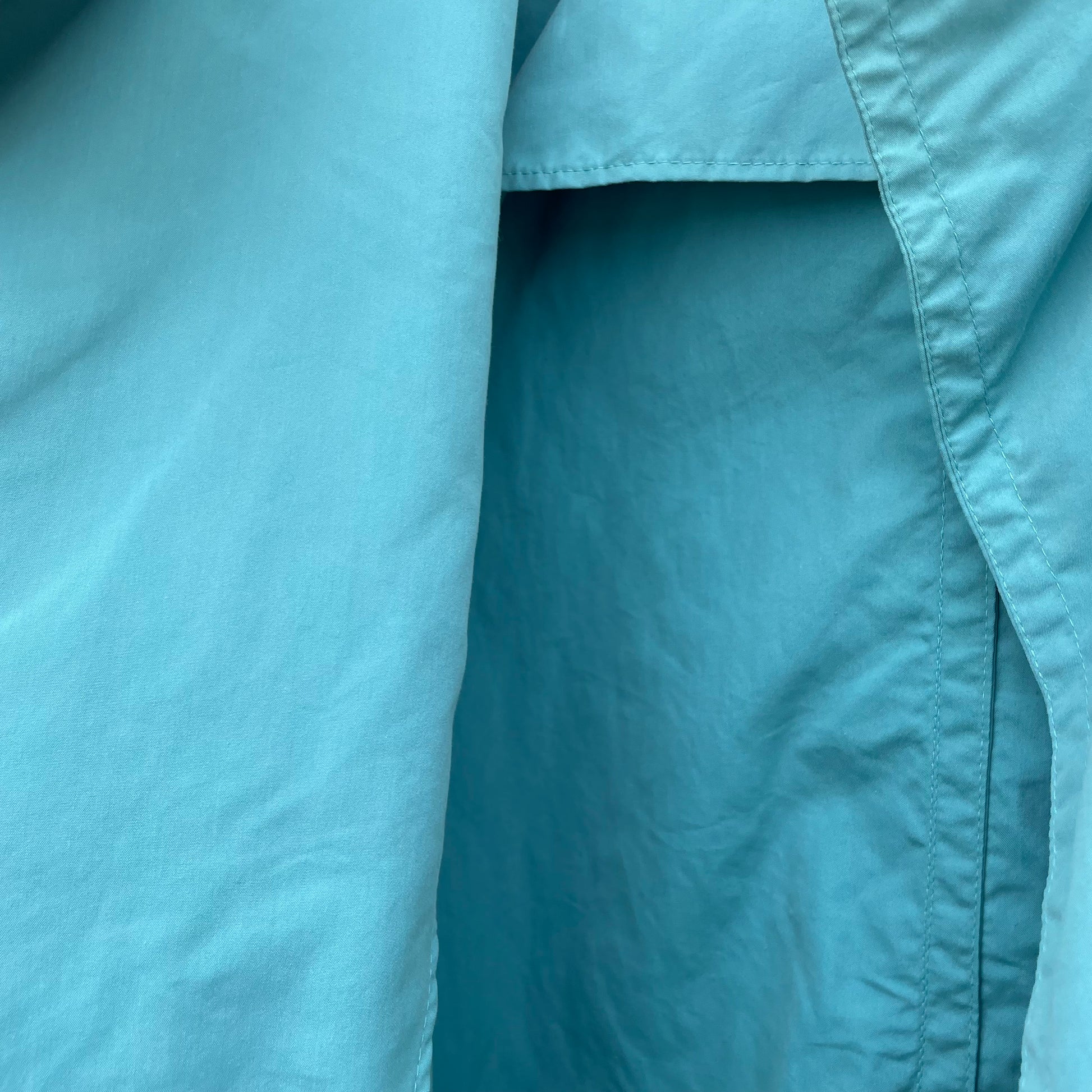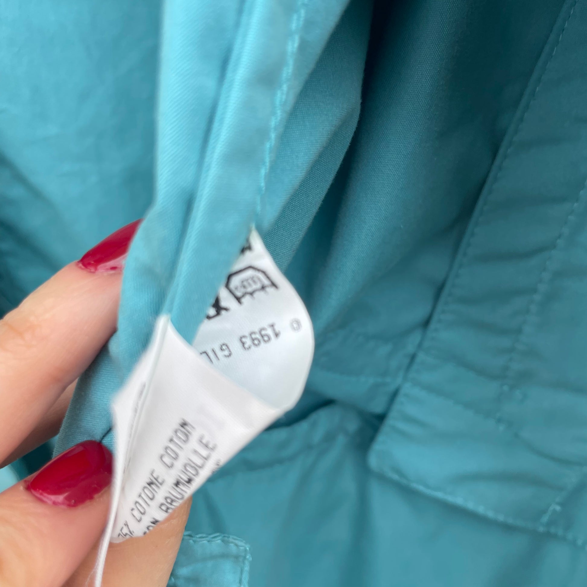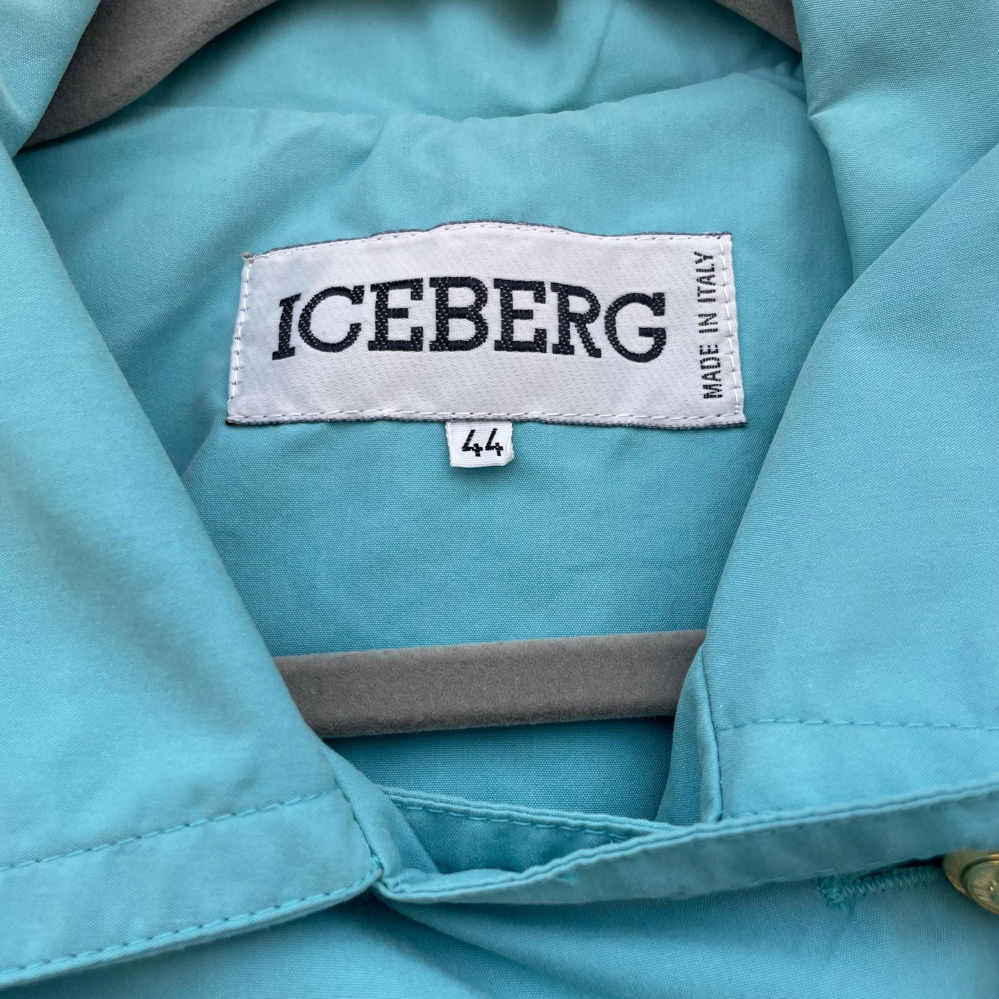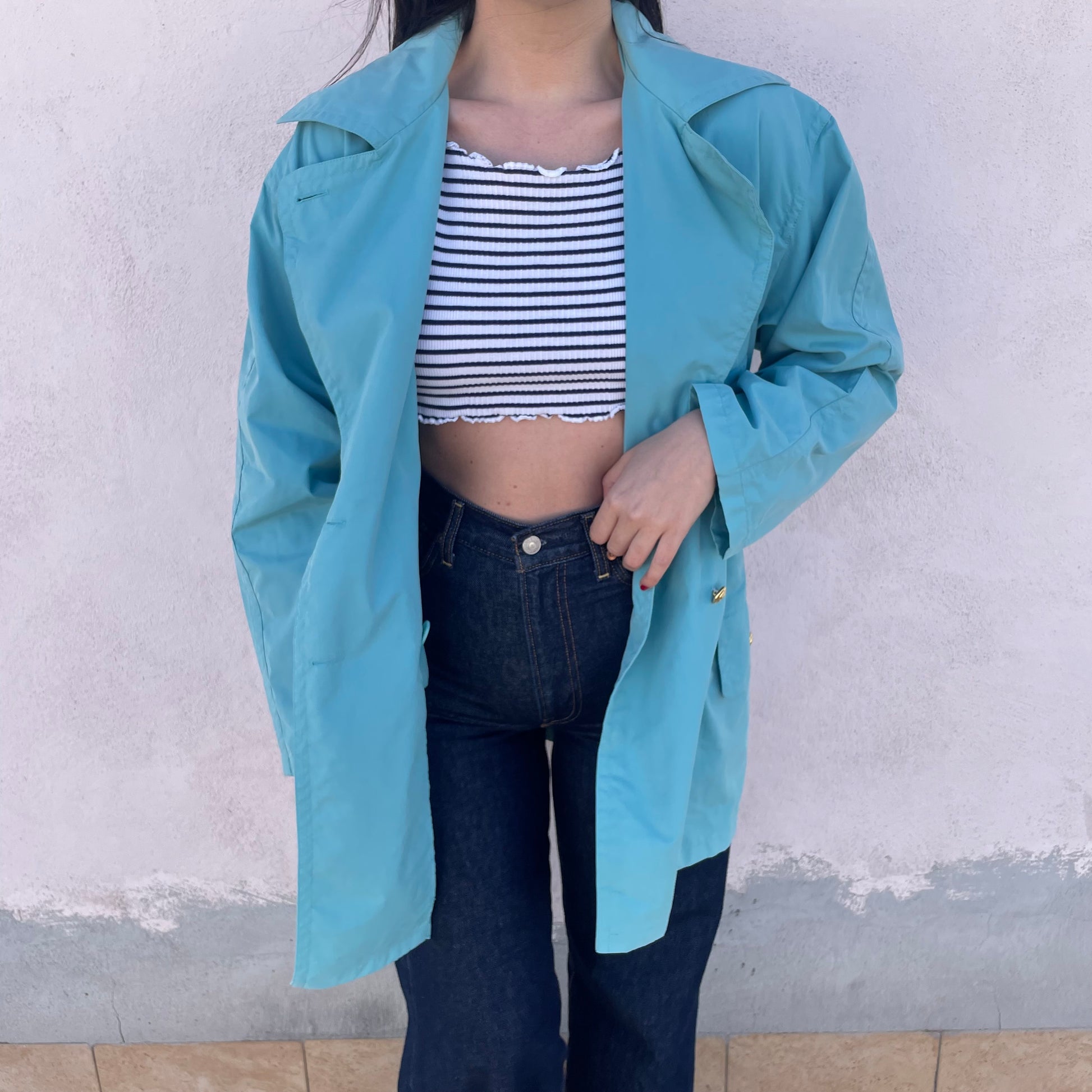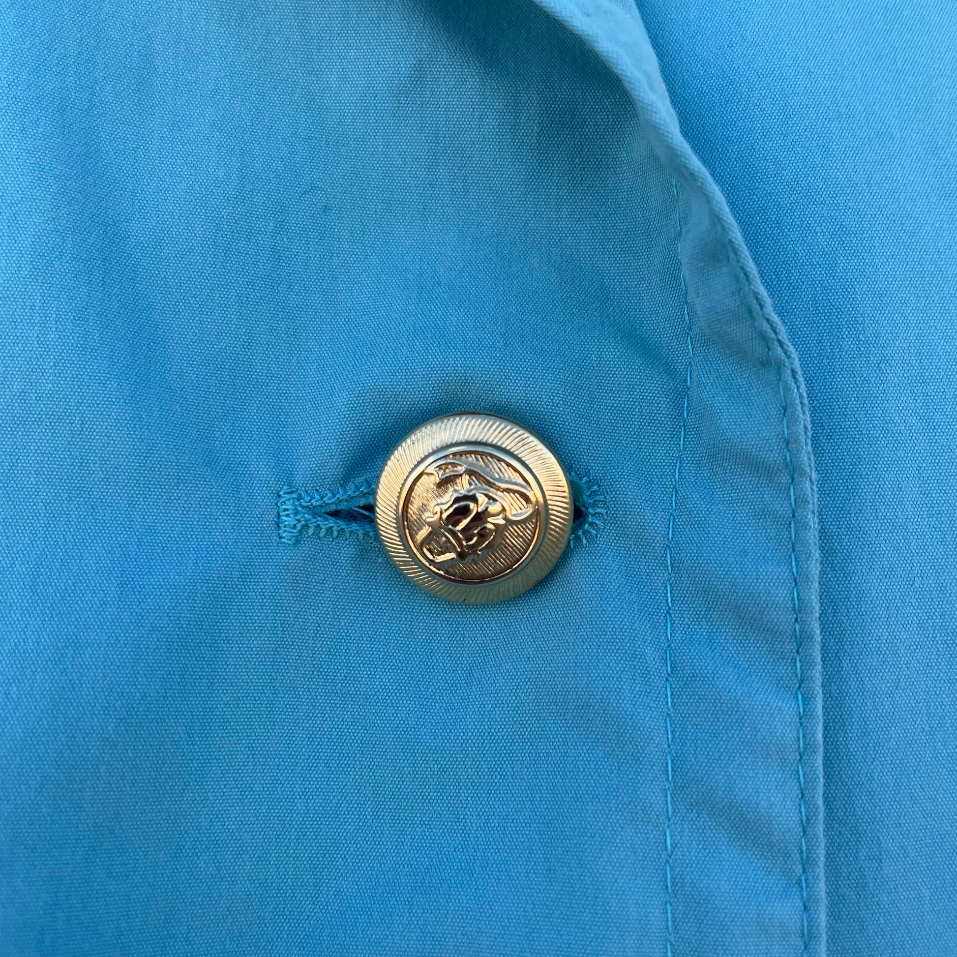 Spolverino Iceberg turchese con bottoni dorati con Paperino. 75% cotone 18% poliestere 7% poliuretano.