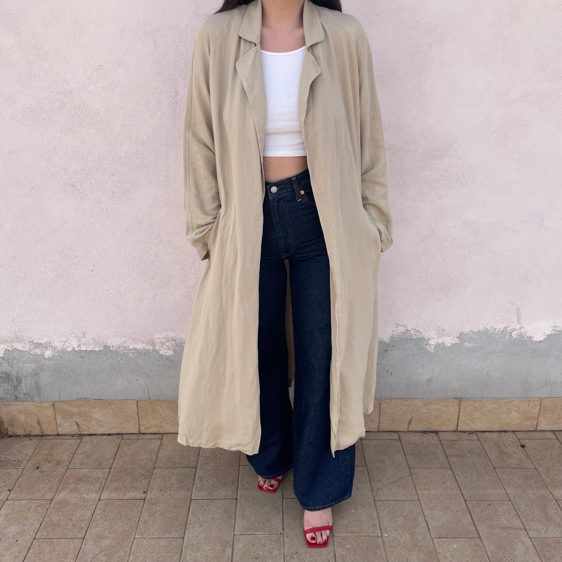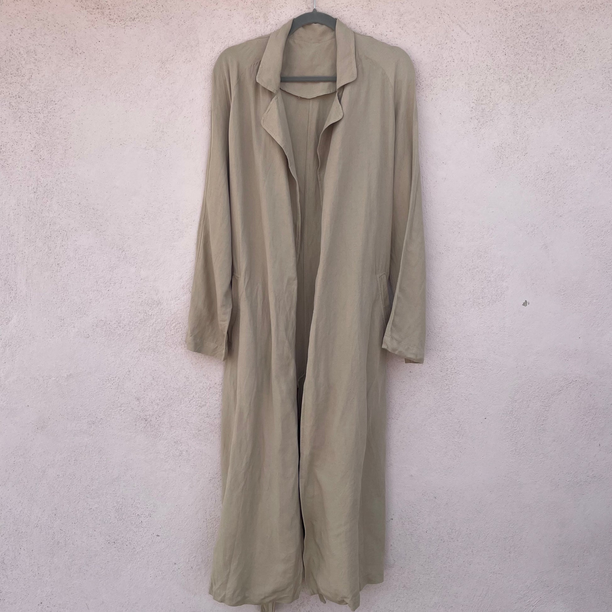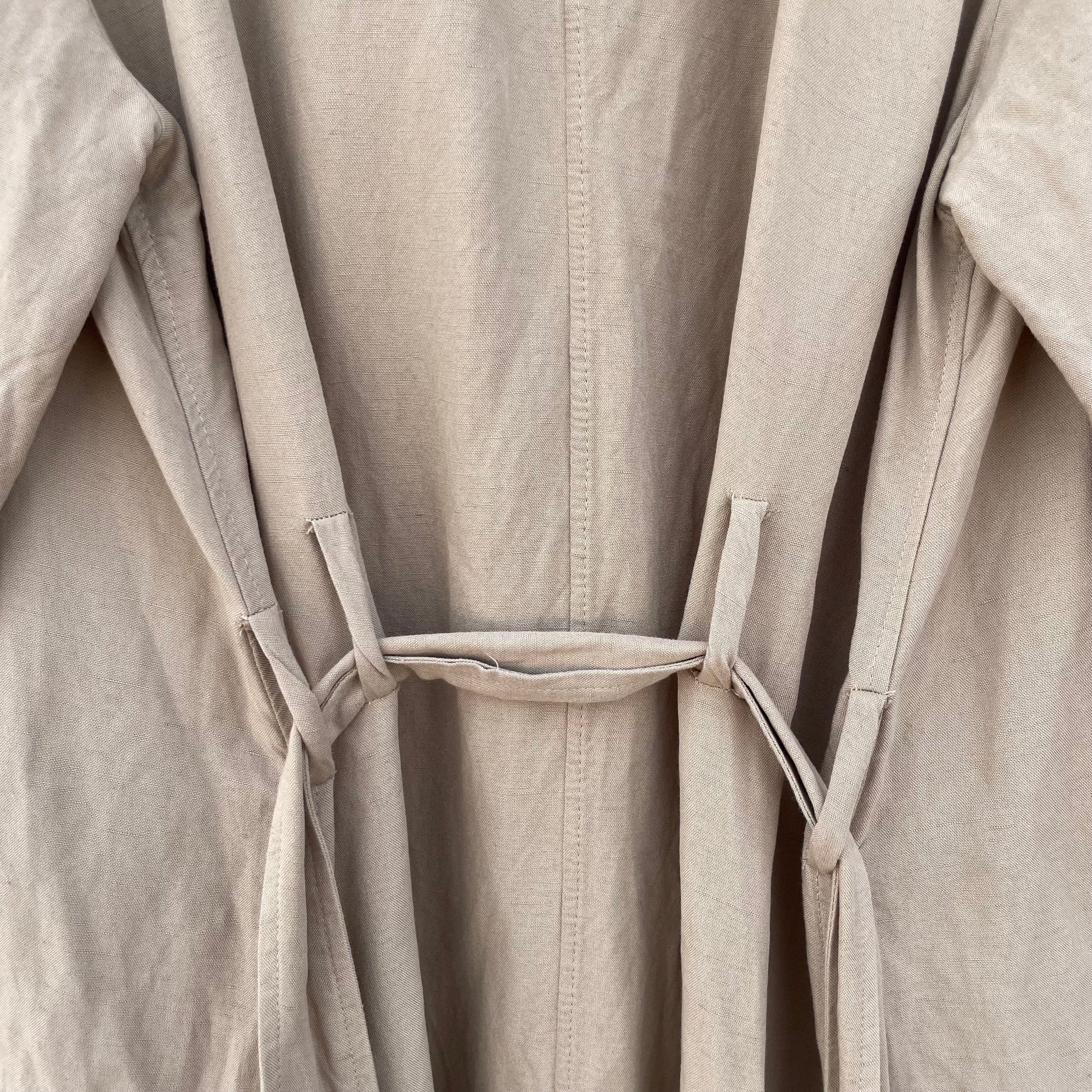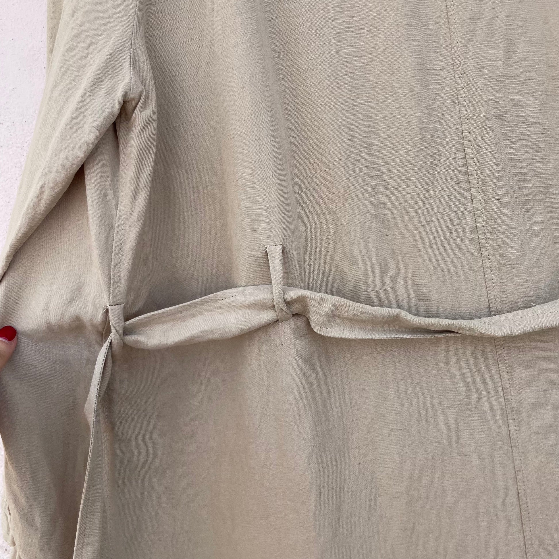 Spolverino sartoriale ecrù con cintura. Manca il merceologico ma al tatto direi che è un lino misto viscosa. Sfoderato.