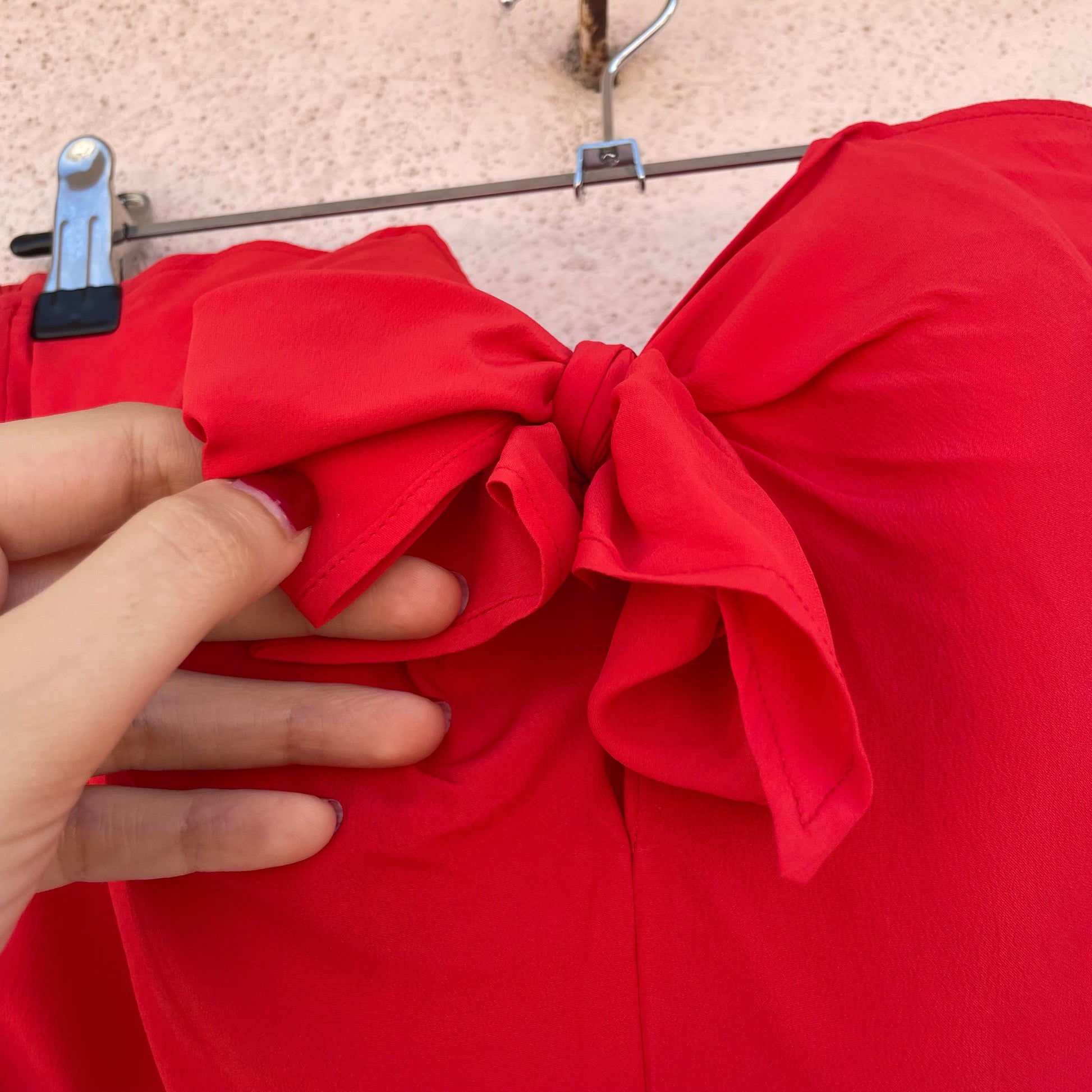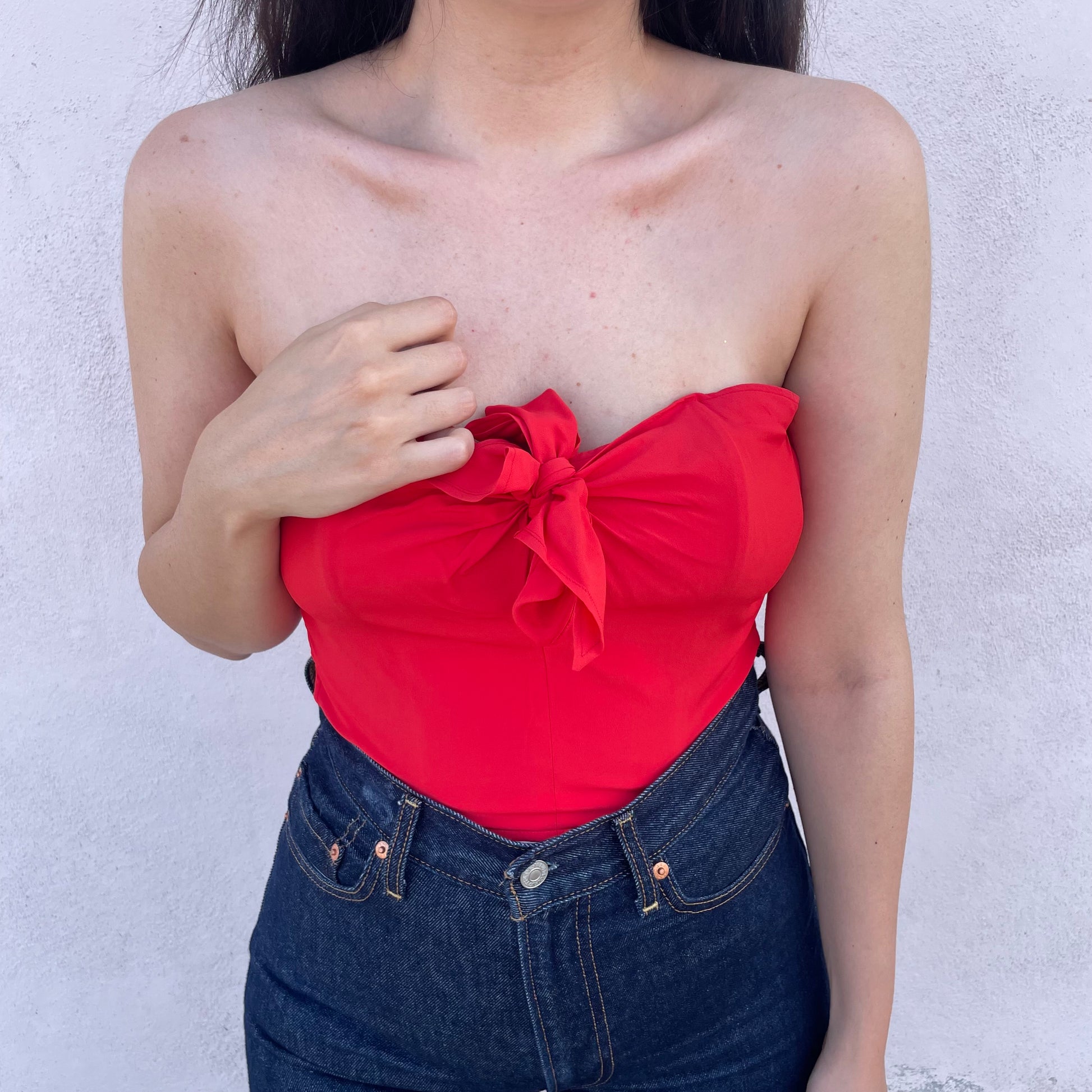 Top bustier rosso Pierre Cardin con fiocco centrale e stecche. Manca il merceologico ma è sicuramente un misto seta. Parte laterale plissé elastica che consente al capo di adattarsi a più misure.