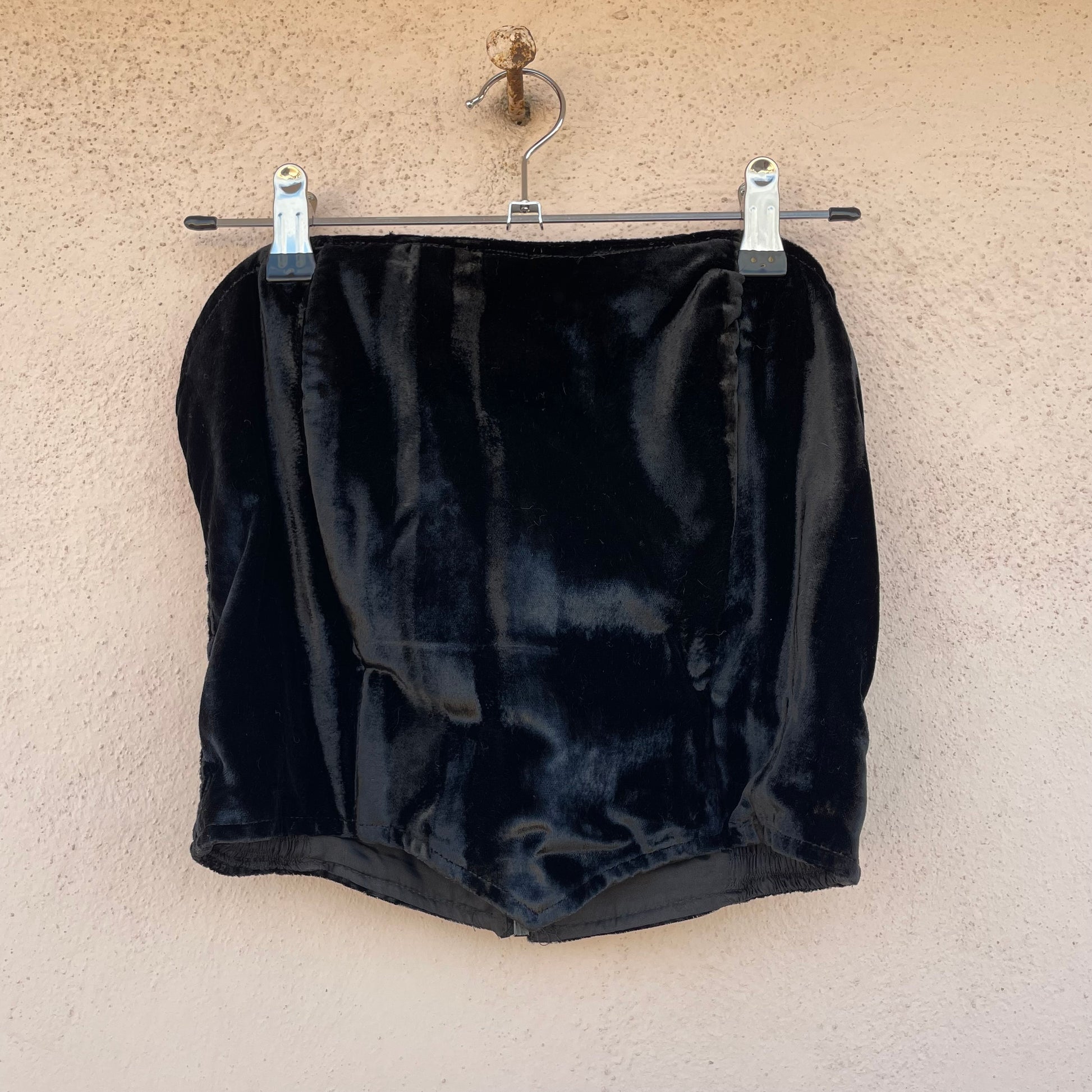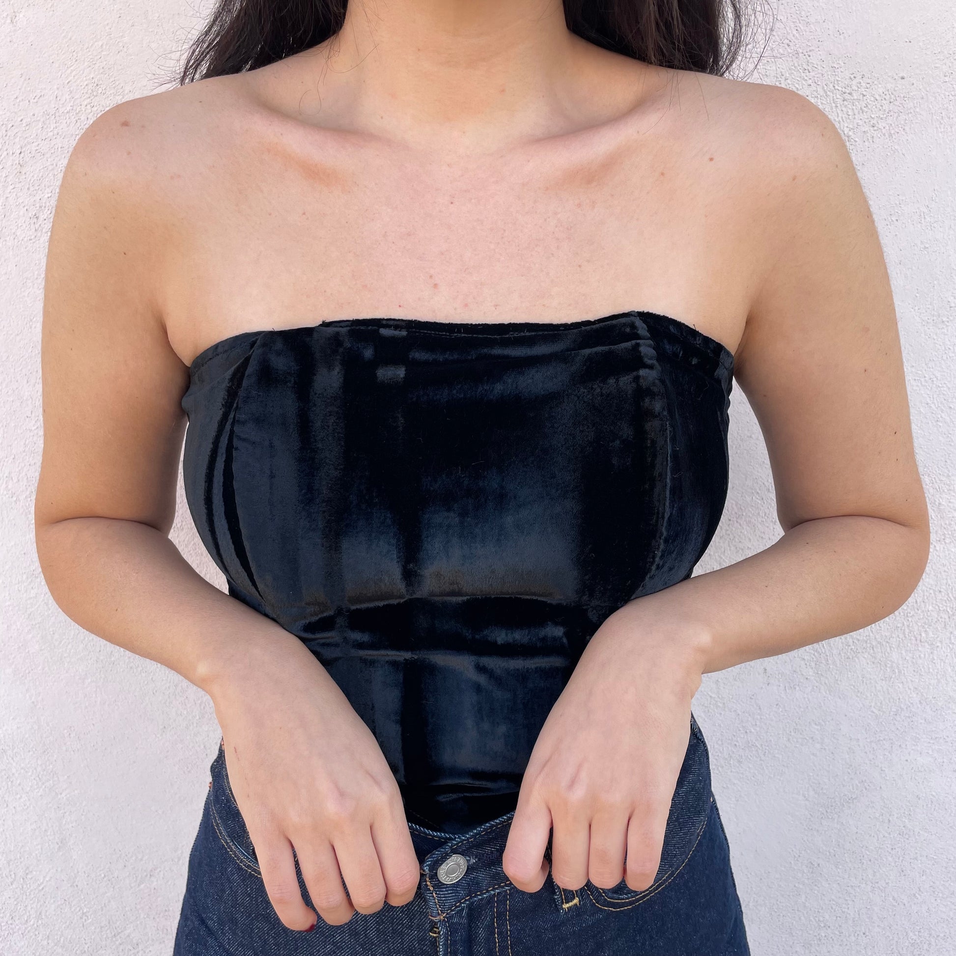 Top bustier in velluto liscio nero con chiusura con zip sul retro. 50% viscosa 35% acetato 15% seta.